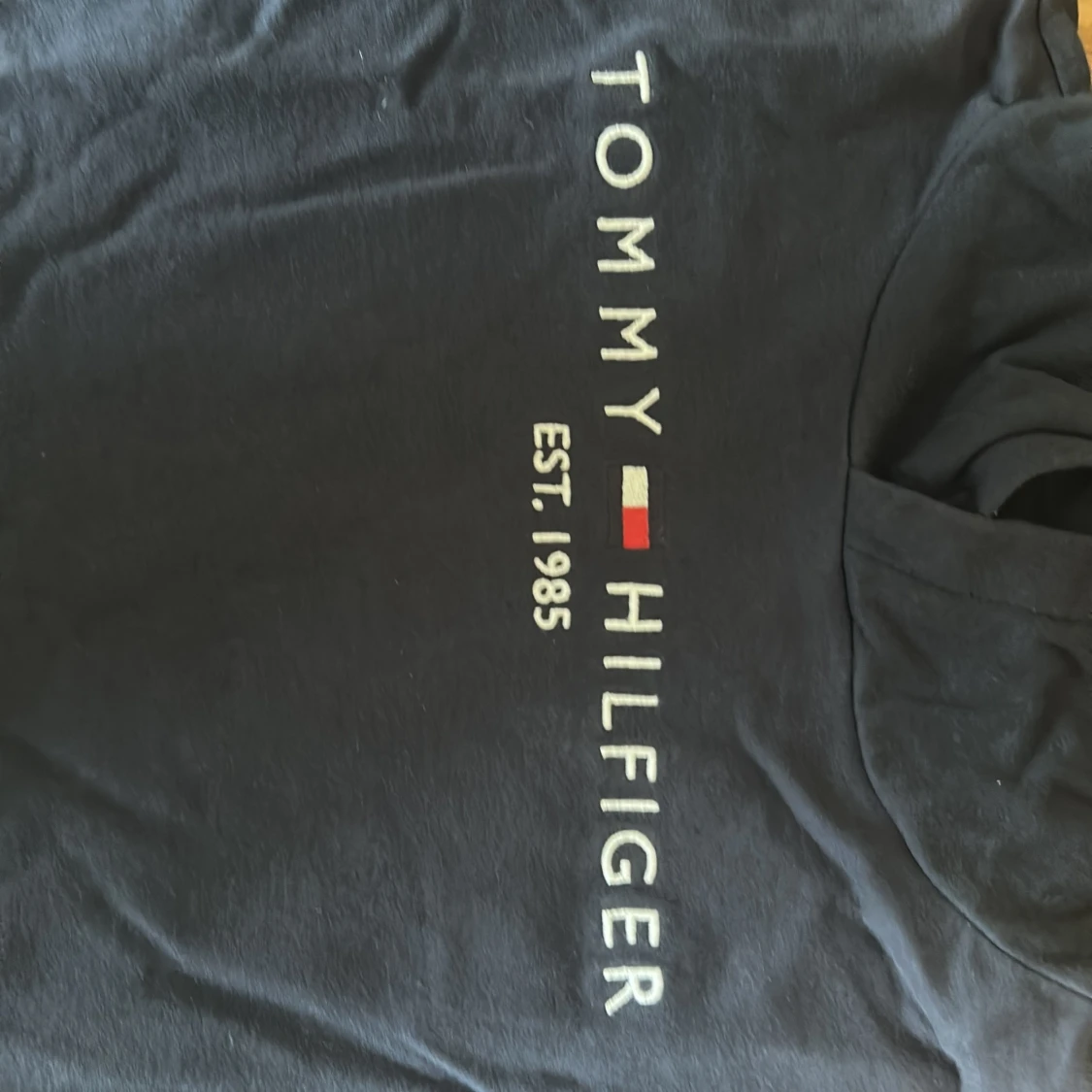 Säljer en mörkblå hoodie från Tommy Hilfiger med logga och texten 'EST. 1985' på bröstet. Tröjan har huva och långa ärmar, perfekt för en avslappnad stil. Klassisk och stilren design med mjukt material.