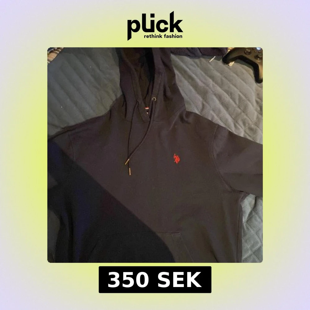 Säljer en mörkblå hoodie från U.S. Polo Assn. med röd broderad logga på bröstet. Tröjan har huva med dragsko och känguruficka framtill. Tillverkad i 100% bomull för en skön och avslappnad känsla.