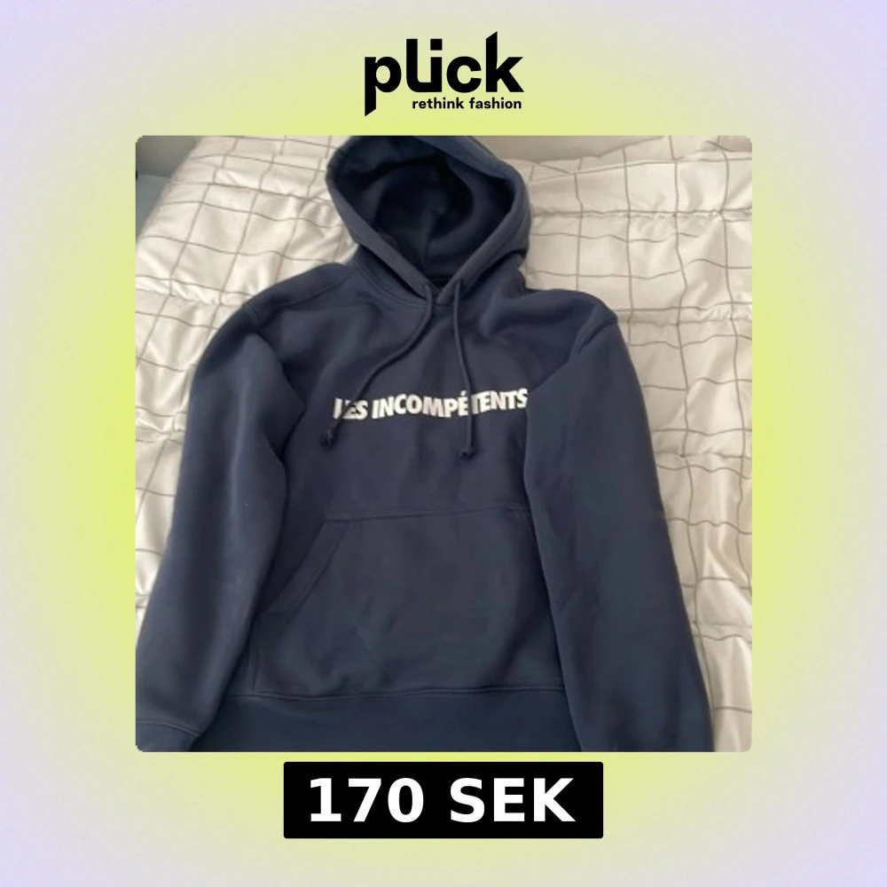Mörkblå hoodie från H&M med vit text 'Les Incompétents' på bröstet. Tröjan har huva med snörning, känguruficka och loose fit. Perfekt för dig som gillar en chill och avslappnad stil.