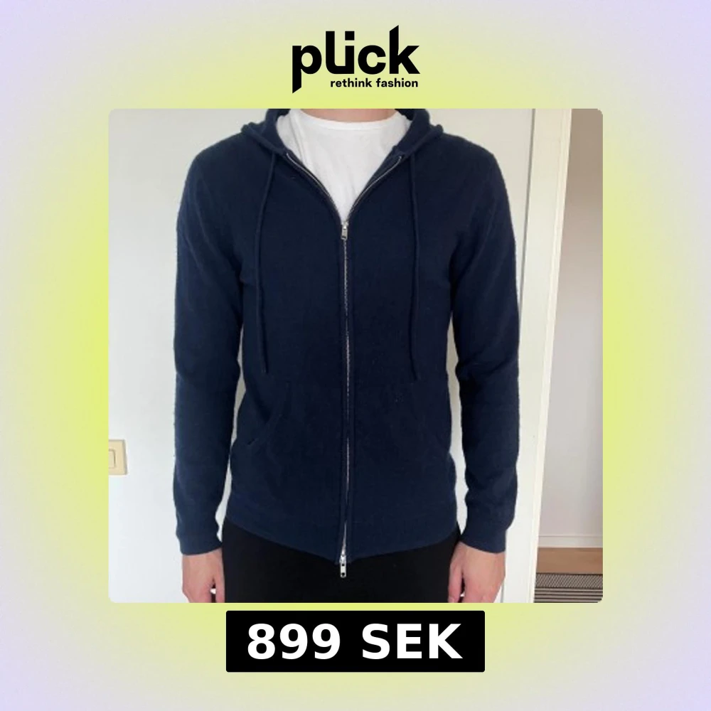 Säljer en mörkblå hoodie i mjuk kashmir från John Henric. Tröjan har dragkedja framtill, huva med dragsko och långa ärmar. Perfekt för dig som gillar stilrena och bekväma plagg.