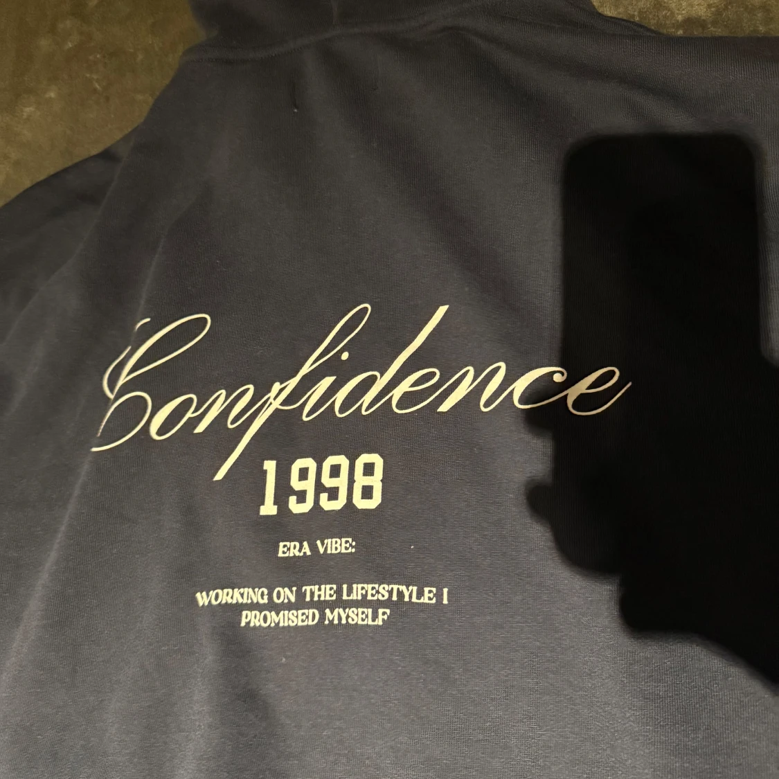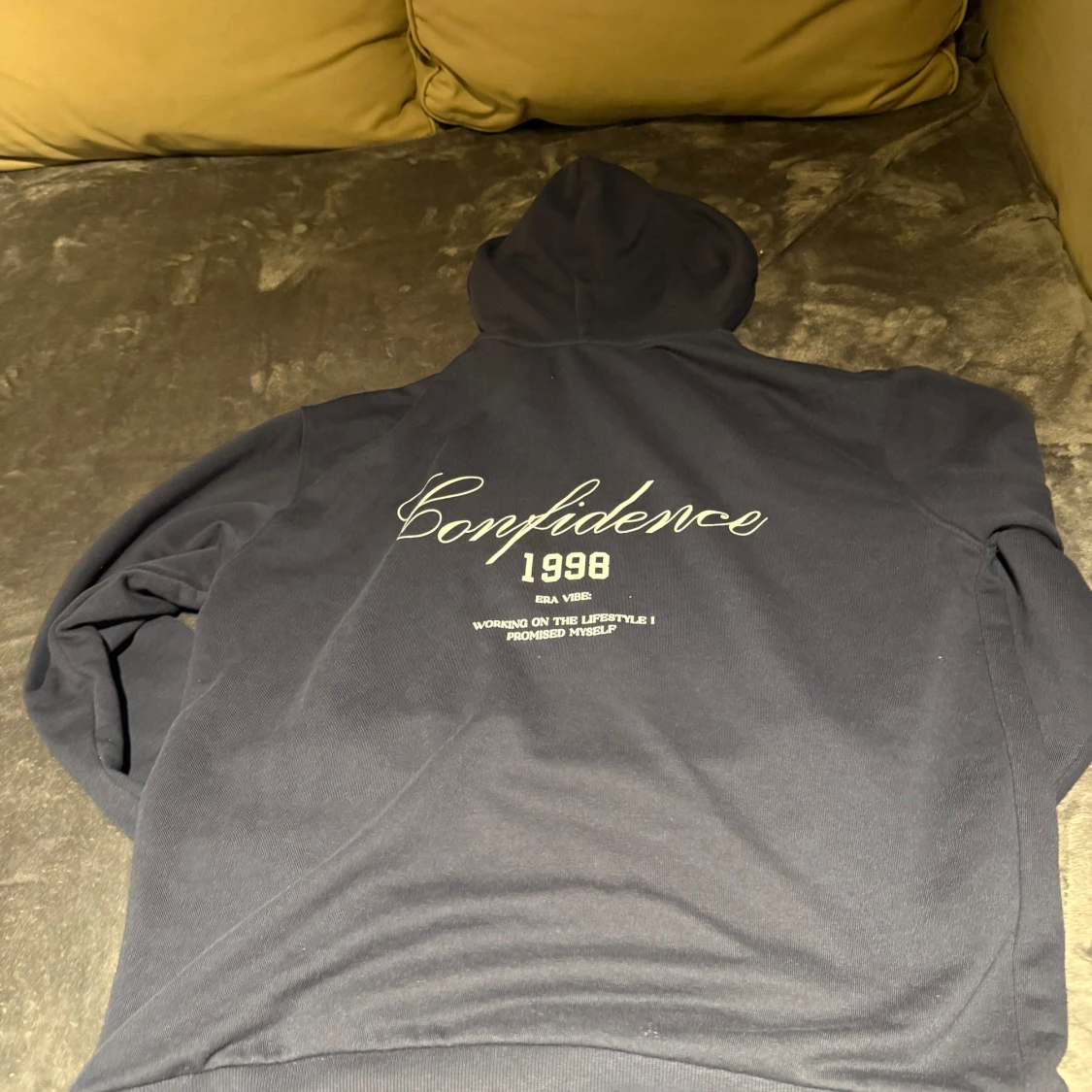 Snygg mörkblå hoodie med huva och känguruficka. På ryggen finns ett stort tryck med texten 'Confidence 1998' och inspirerande citat. Perfekt för dig som gillar streetstyle och vill ha en chill look.