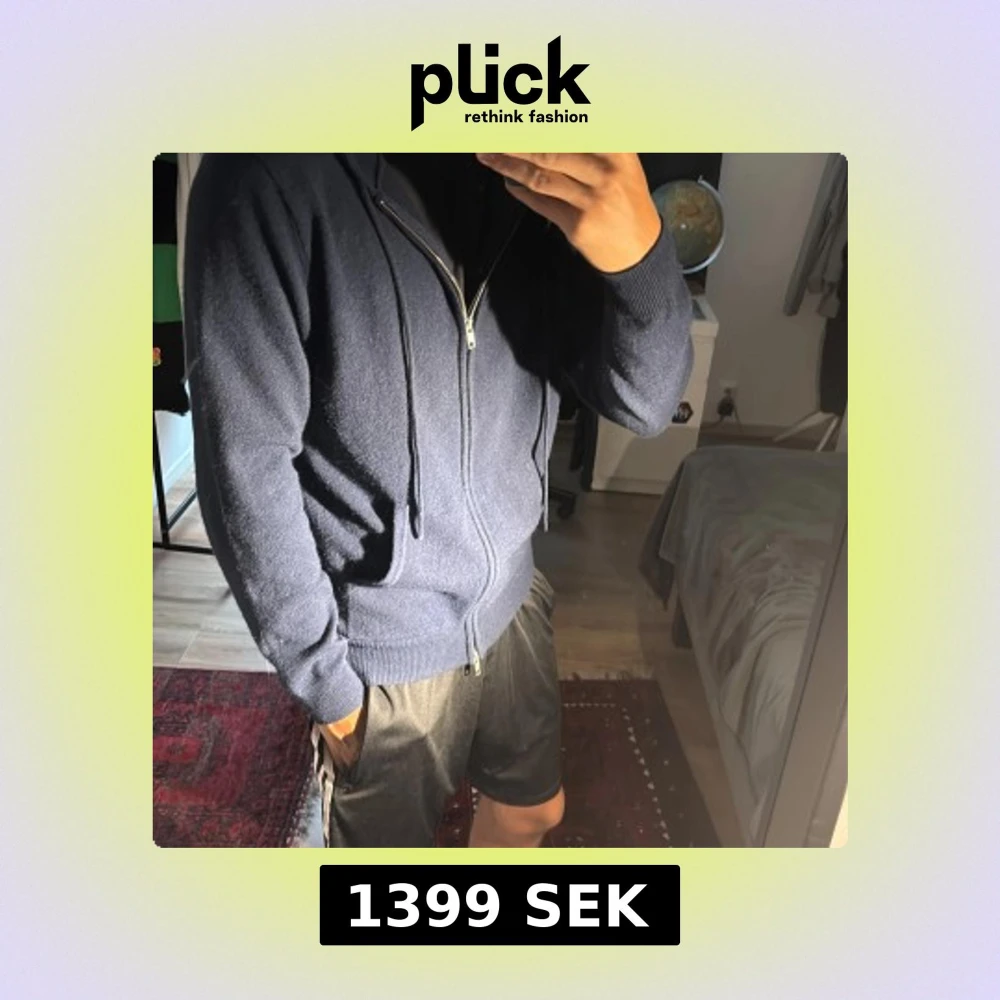 Säljer en mörkblå hoodie med dragkedja och huva. Tröjan har långa ärmar, fickor framtill och en clean look utan mönster eller logga. Perfekt för chill dagar och enkel att matcha med jeans eller joggers. Materialet känns mjukt och bekvämt mot huden. Den är i nyskick! 100% Kashmir!