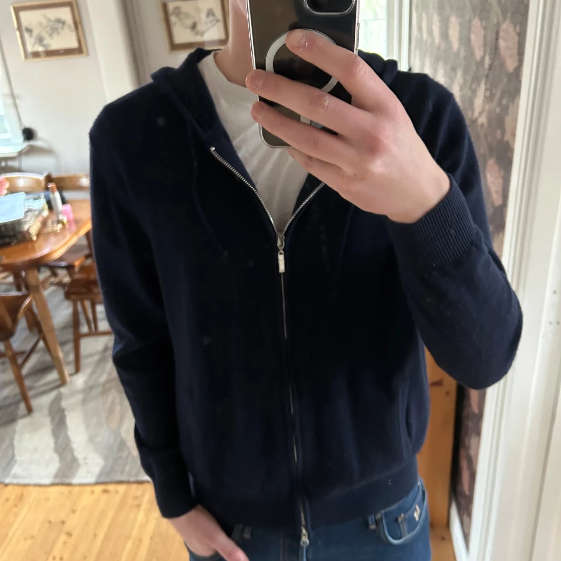 Säljer en stilren mörkblå hoodie med dragkedja. Tröjan har långa ärmar och en praktisk huva. Perfekt för en avslappnad look.skick 8/10 inga defekter. Skriv vid frågor 🙌