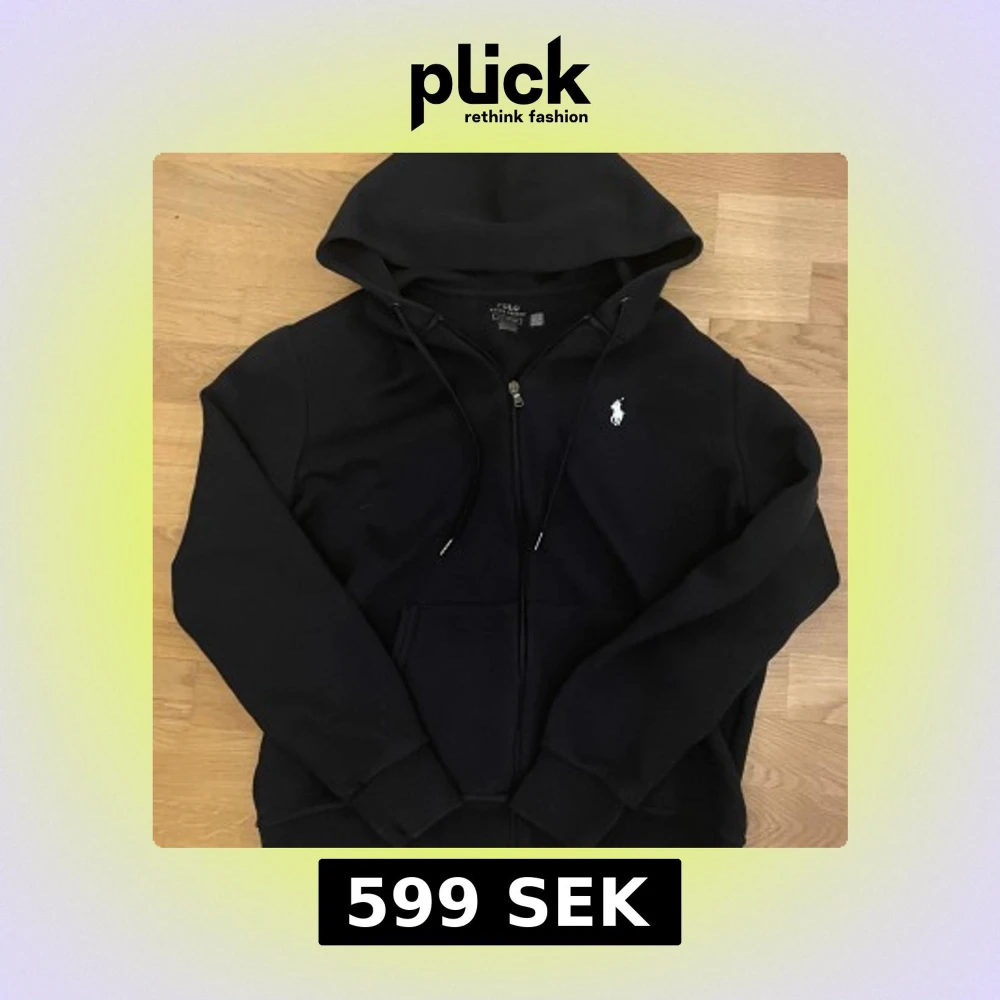 Svart hoodie från Polo Ralph Lauren med klassisk vit logga på bröstet. Tröjan har huva med snörning, dragkedja framtill och en stor ficka på magen. Storlek L men passar också bra som storlek M