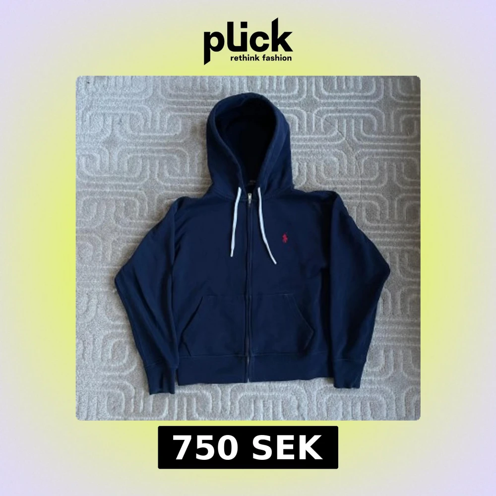 Säljer en snygg mörkblå hoodie från Polo Ralph Lauren med dragkedja och vit snörning i huvan. Den har en liten röd logga på bröstet och praktiska fickor framtill. Perfekt för en avslappnad stil.