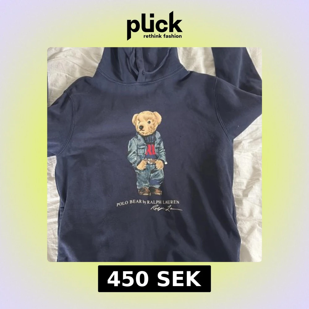 Säljer en mörkblå hoodie från Ralph Lauren med den ikoniska Polo Bear-trycket på framsidan. Tröjan har huva och långa ärmar, perfekt för en avslappnad och cool stil. Klassisk och tidlös design med mjukt material.
