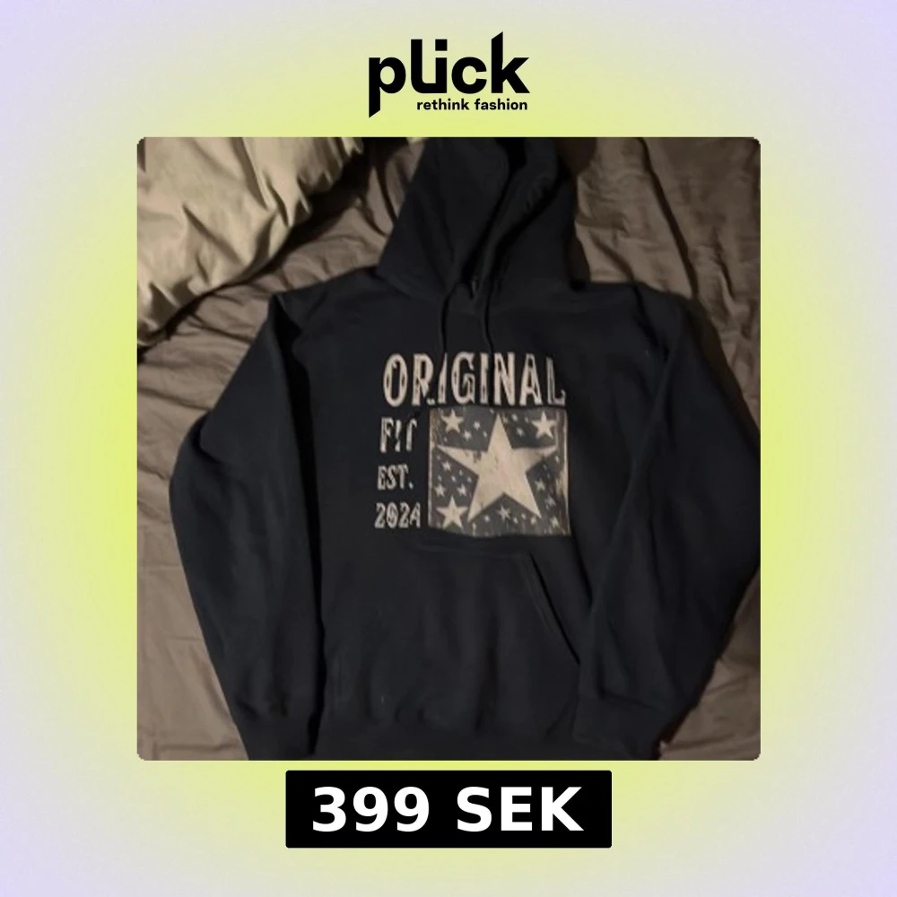Snygg mörkblå hoodie från Gildan med stort tryck på bröstet där det står 'ORIGINAL' och en stor vit stjärna omgiven av mindre stjärnor. Tröjan har huva med snörning och en klassisk känguruficka framtill. Perfekt för dig som gillar streetwear vibes.