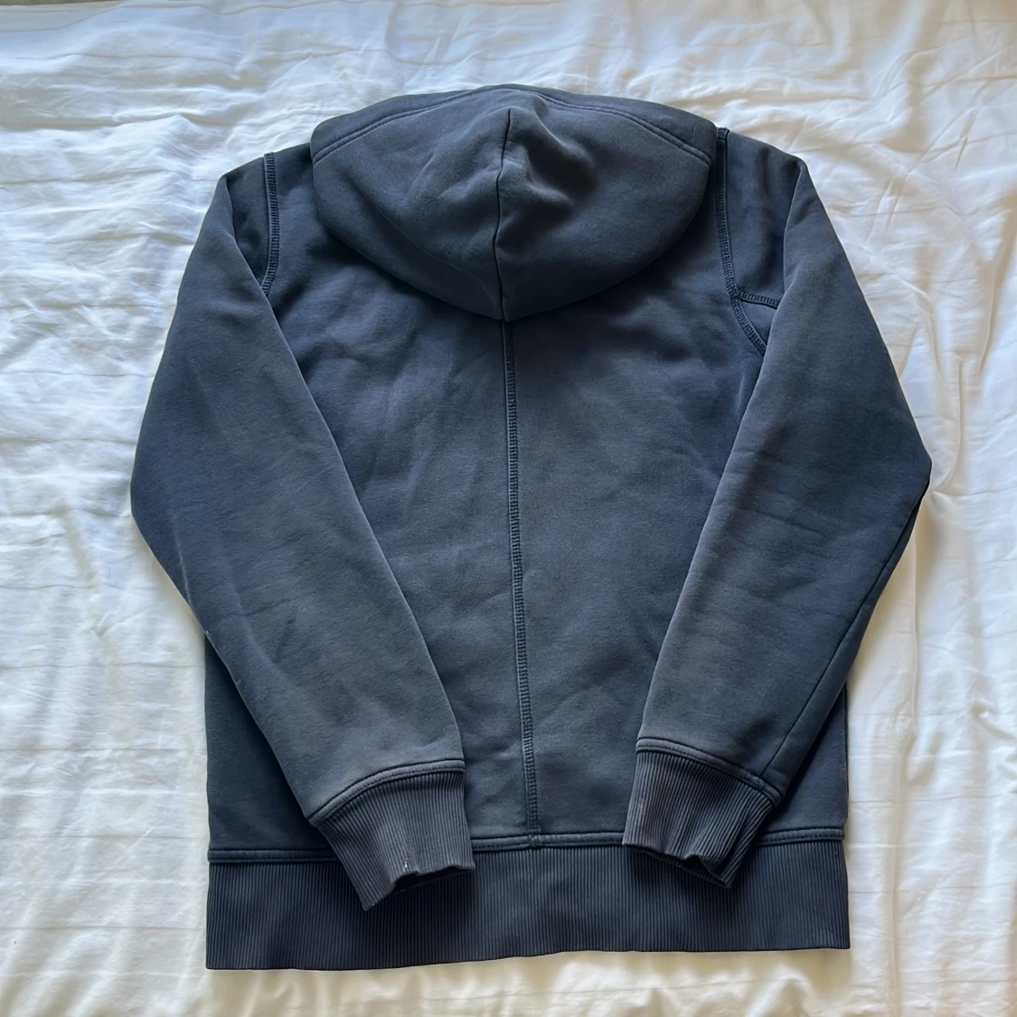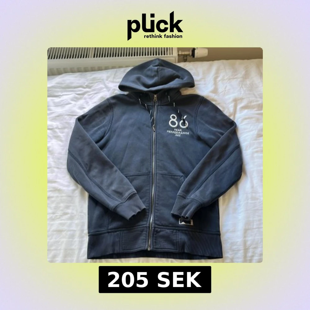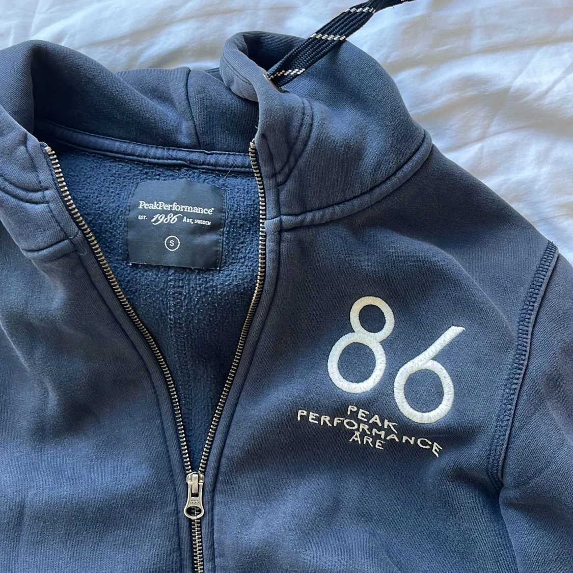 Mörkblå hoodie från Peak Performance med dragkedja och huva. Snyggt broderad logga och siffran 86 på bröstet. Mjukt fleecefoder på insidan och ribbade muddar. Perfekt för chill eller träning, med praktiska fickor och snörning i huvan.storlek S men sitter som M. Passar 170-178.