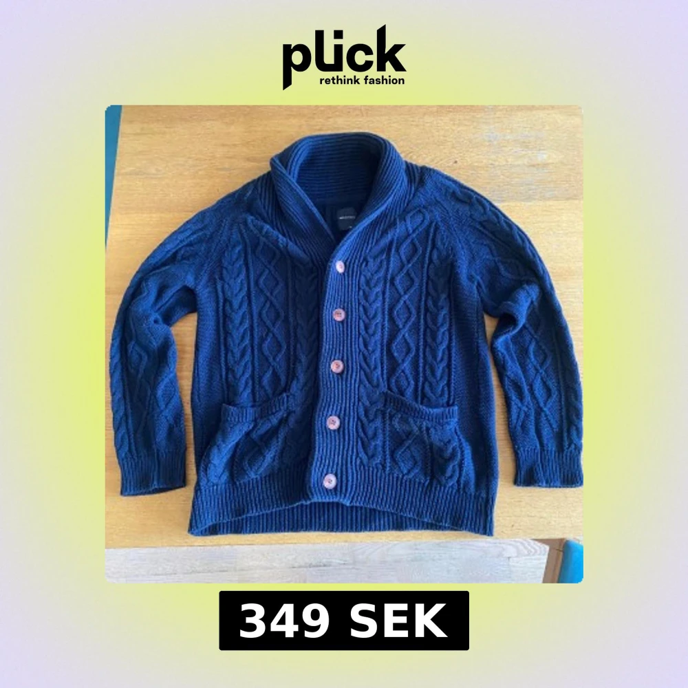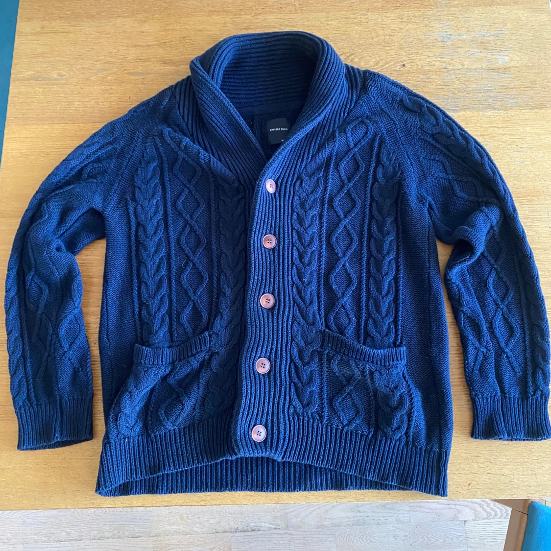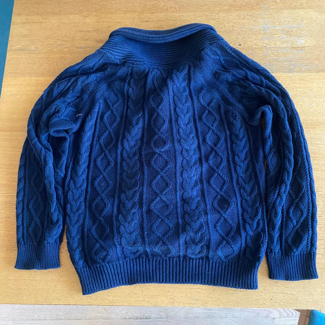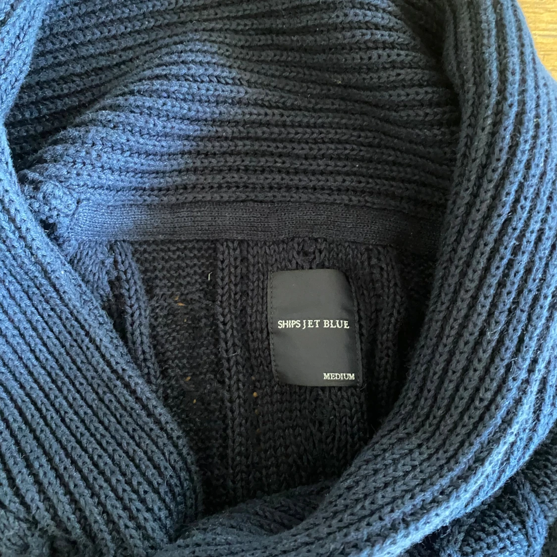 Mörkblå kabelstickad kofta från SHIPS JET BLUE i storlek medium. Koftan har grovstickat mönster, stora ribbade muddar, två fickor fram och stängs med knappar. Perfekt för lager-på-lager och chill höst- eller vinterstil.