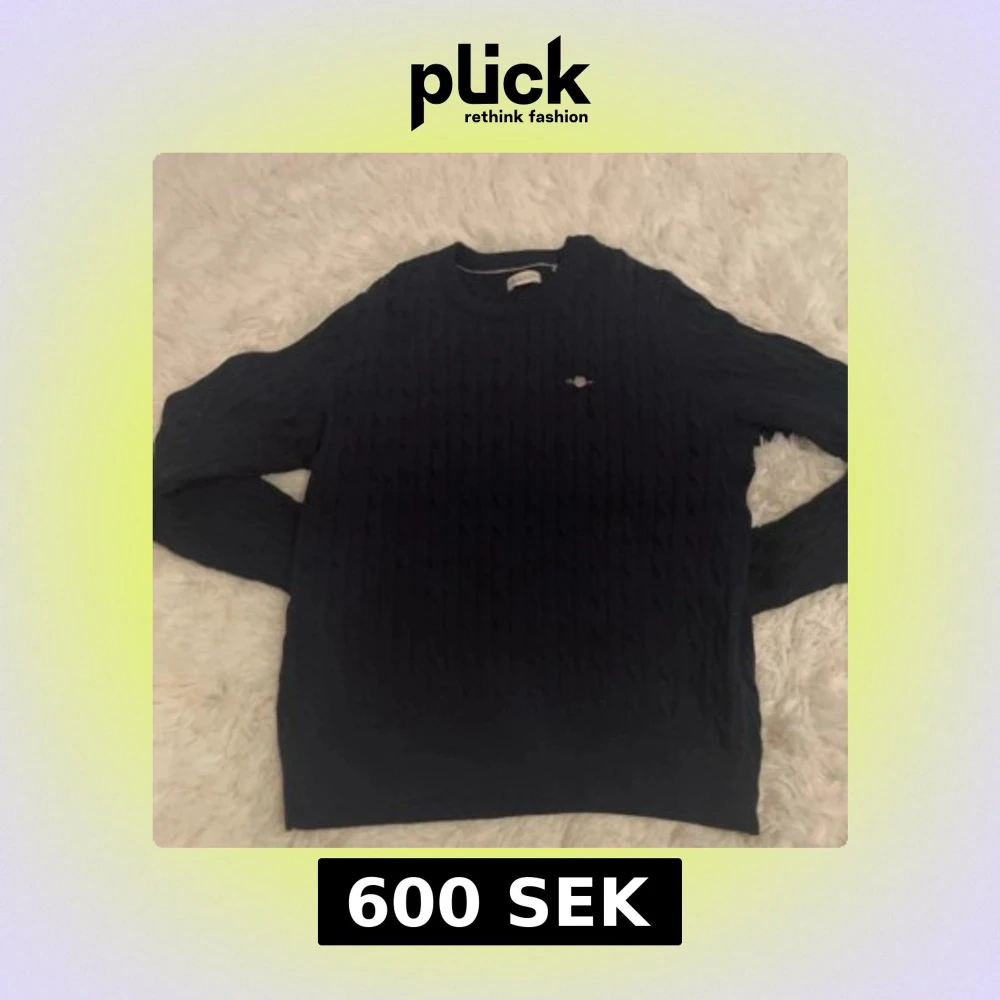 Säljer en stilren mörkblå kabelstickad tröja från GANT. Tröjan har en rund halsringning och ett diskret broderat GANT-emblem på bröstet. Perfekt för en klassisk och tidlös look. Storlek 13-14 år på den, jag är 175cm och den passar bra men lite kort