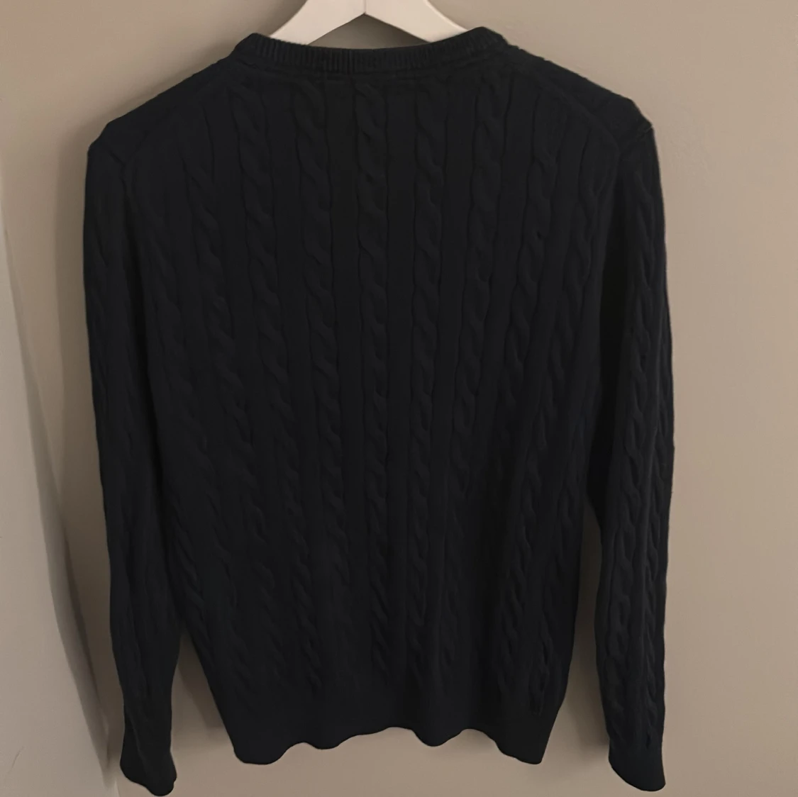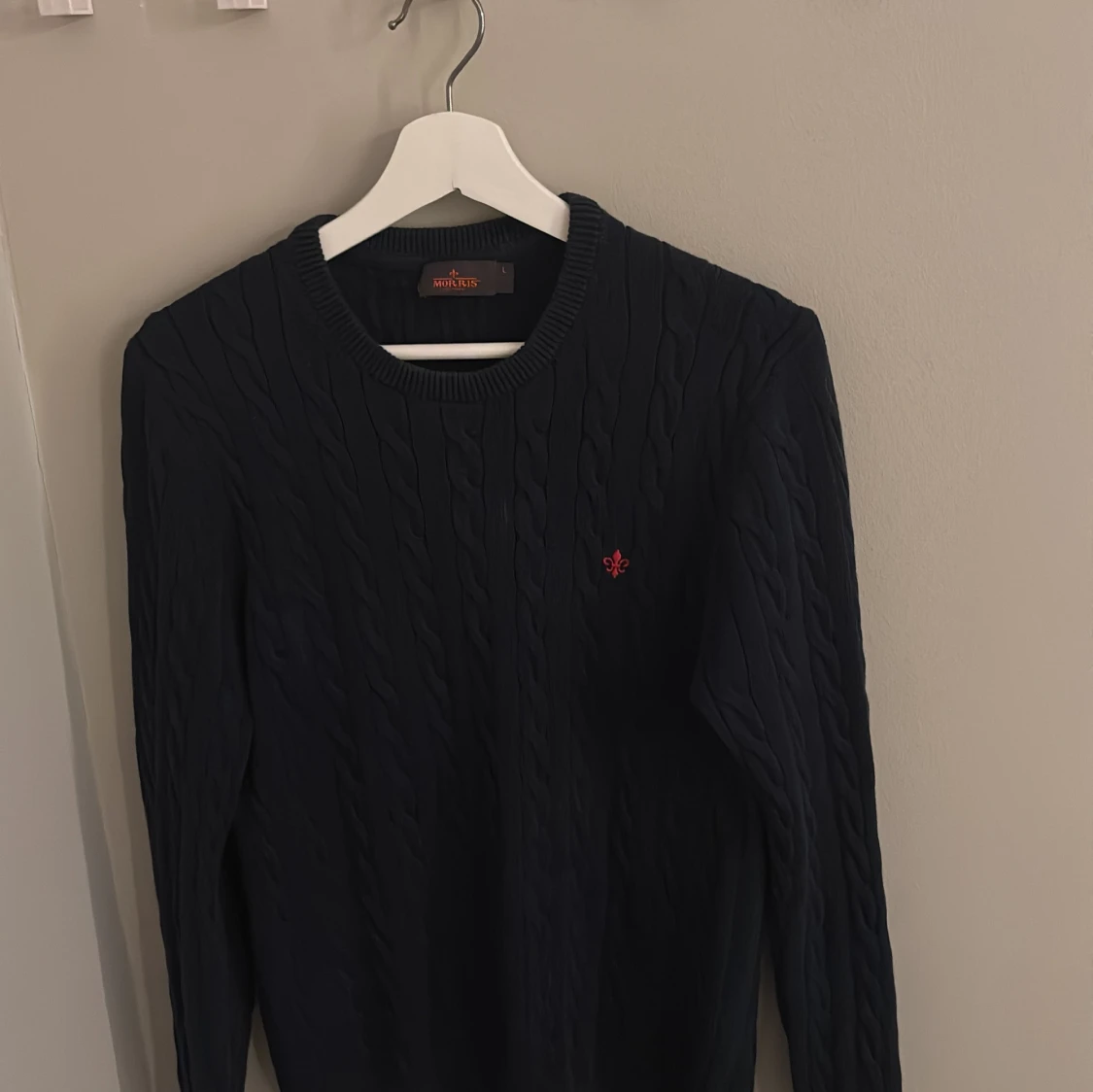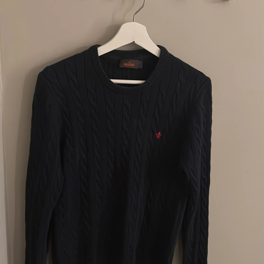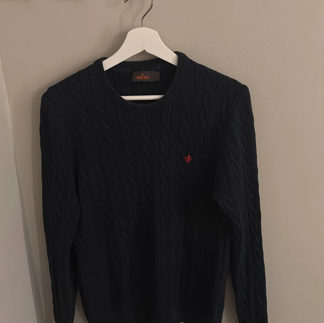Säljer en stilren mörkblå kabelstickad tröja från morris. Storleken är L men sitter som S,XS enligt mig. Hör av er vid frågor mvh Elji.