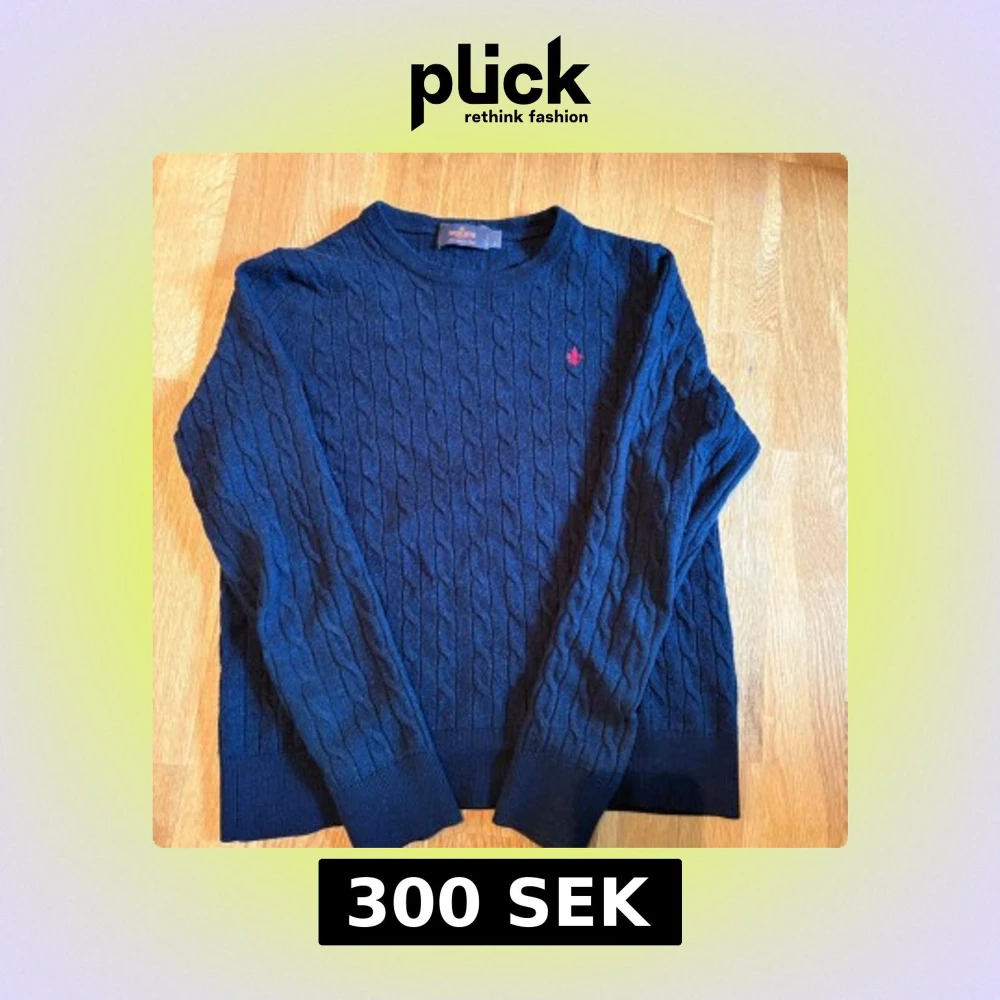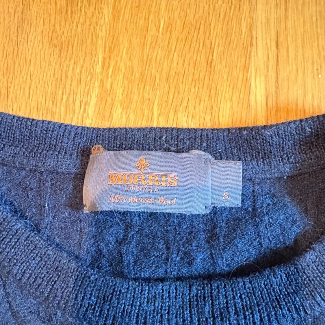 Säljer en mörkblå kabelstickad tröja från Morris i 100% merinoull. Tröjan har rund halsringning, lång ärm och en röd broderad logga på bröstet. Perfekt för lager-på-lager och snygg till jeans eller kjol. Det står S på tröjan men den sitter som XS