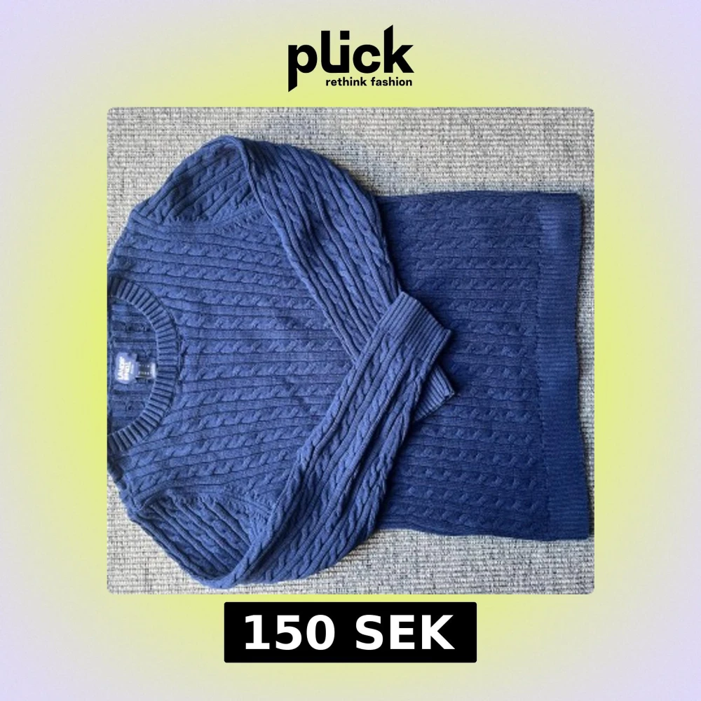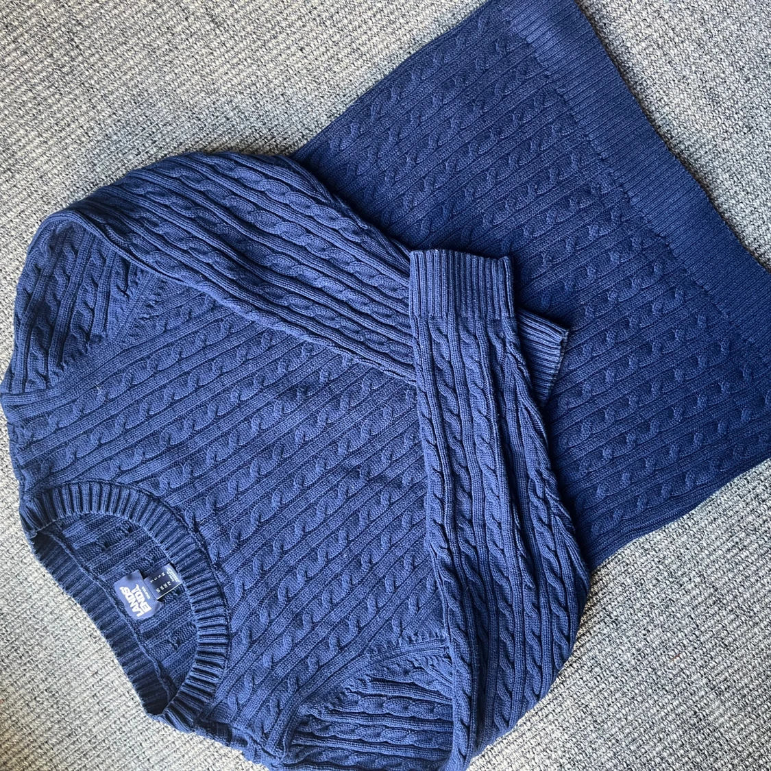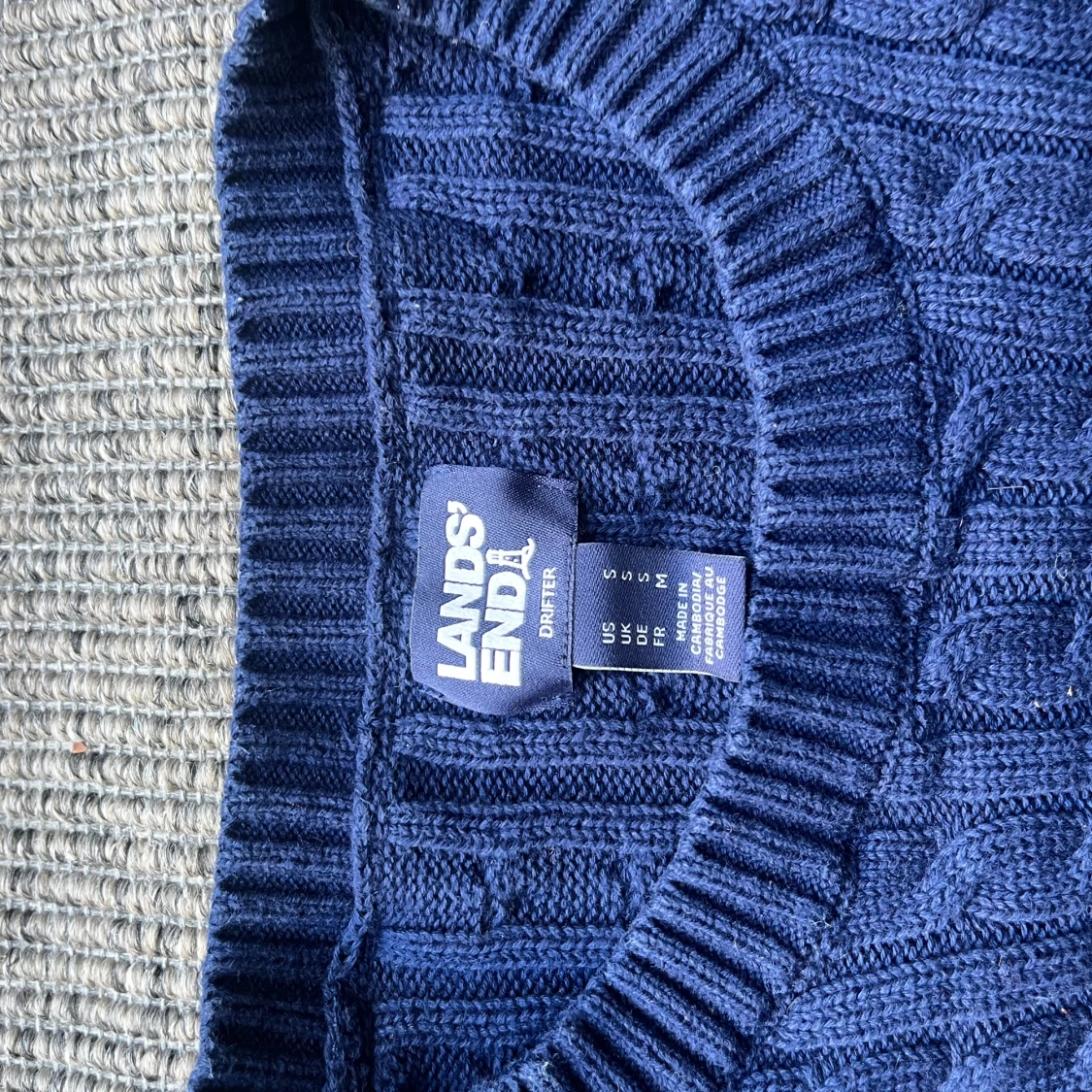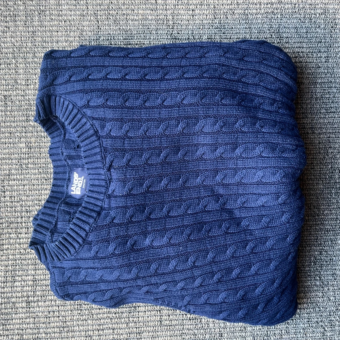 Kabelstickad mörkblå tröja från Lands' End med rund halsringning och ribbade muddar. Klassisk och stilren modell i mjuk bomull, perfekt för lager-på-lager. Snygg struktur och normal passform, passar till allt. Postar snabbt!