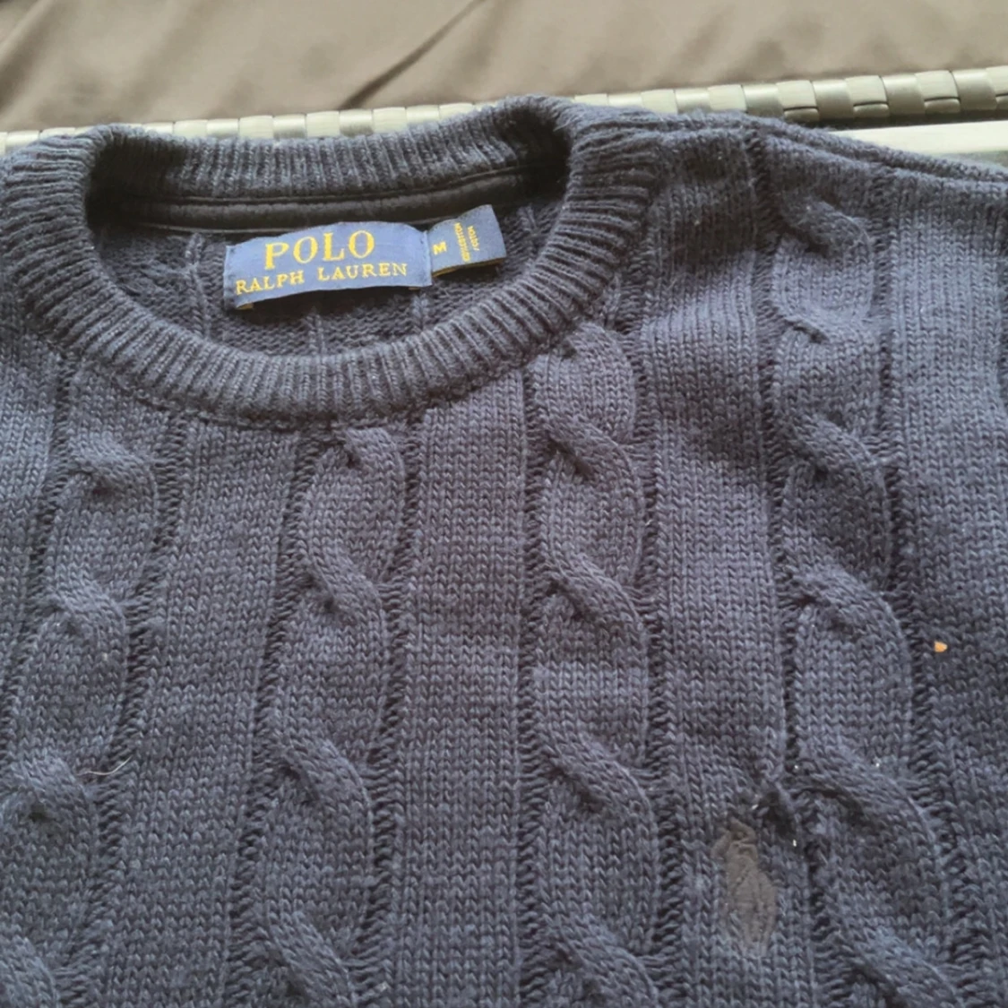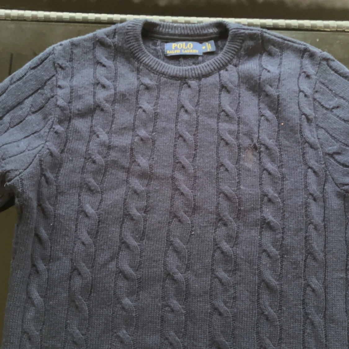 Kabelstickad mörkblå tröja från Polo Ralph Lauren med rund halsringning och diskret broderad logga på bröstet. Tröjan har lång ärm och klassisk passform, perfekt för dig som gillar stilren och tidlös look.