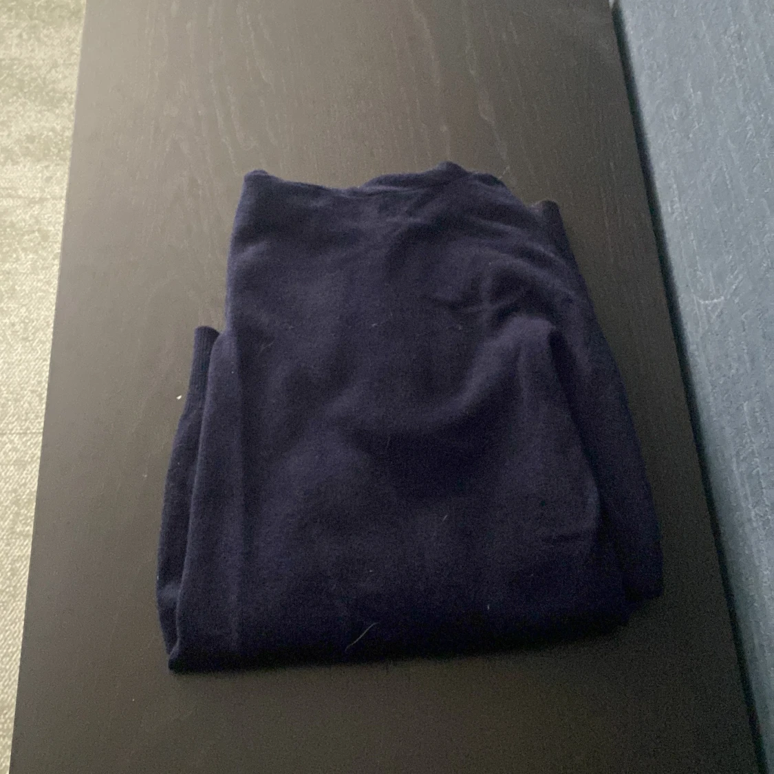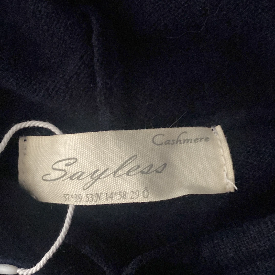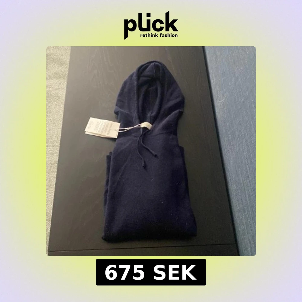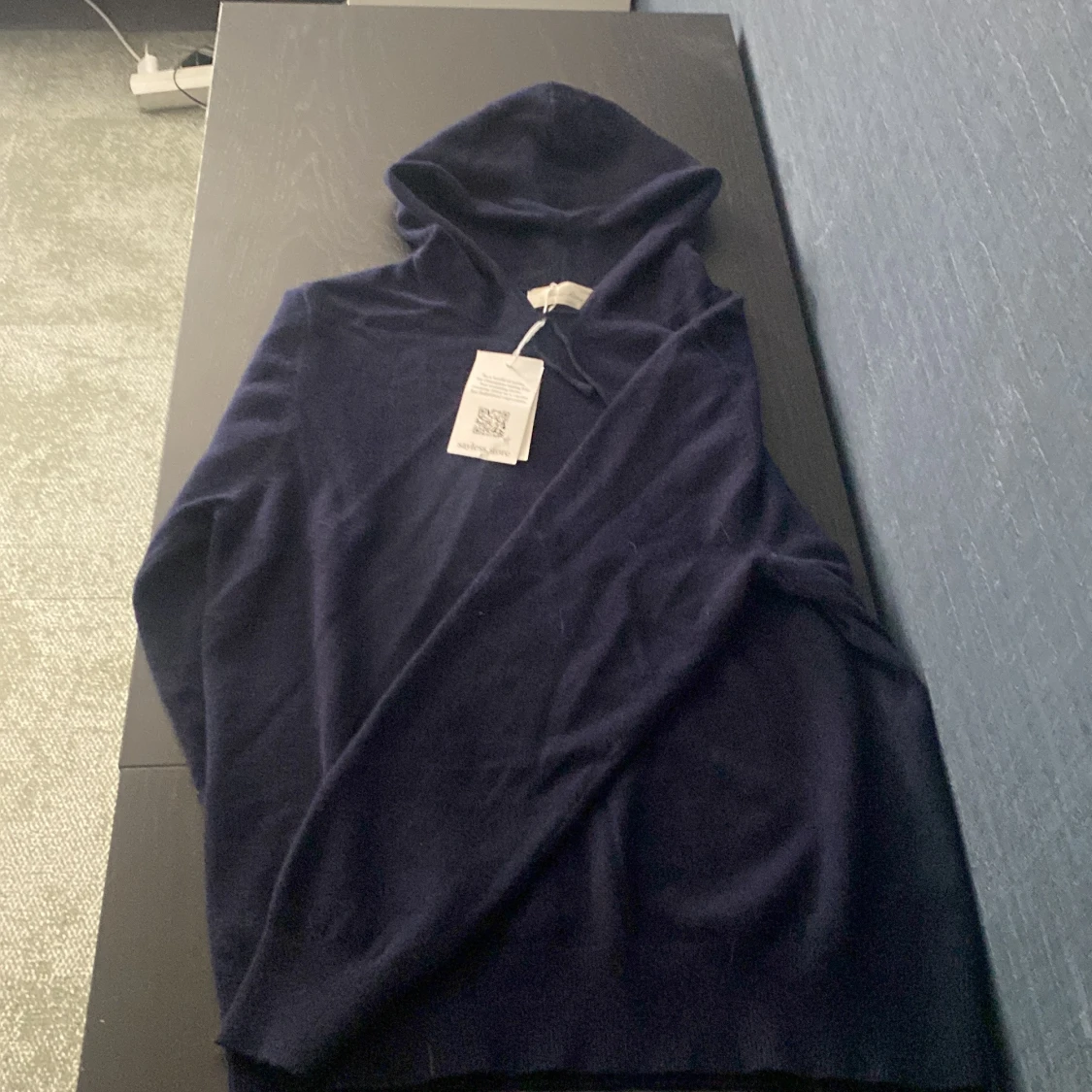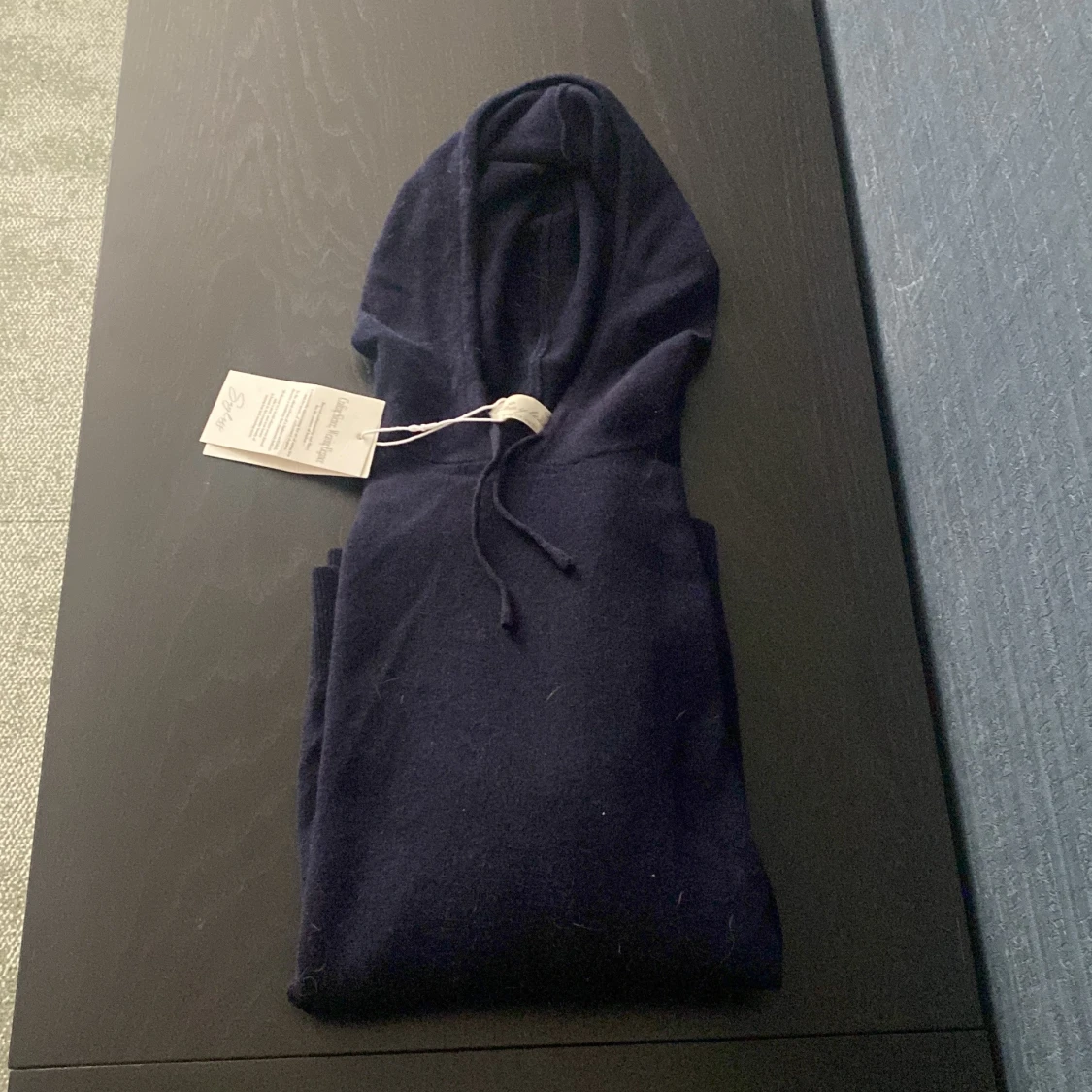 mörkblå tröja i kashmir från Sayless med huva. Tröjan har lång ärm och en enkel, stilren design som passar perfekt till vardags. Superskön och lyxig känsla tack vare det mjuka materialet.Helt ny, aldrig använd