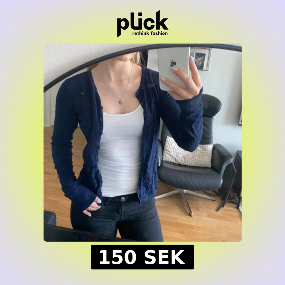 Säljer en enkel och stilren mörkblå kofta med långa ärmar och knäppning framtill. Perfekt att slänga över ett linne eller t-shirt. Snygg och tidlös modell som passar till det mesta.