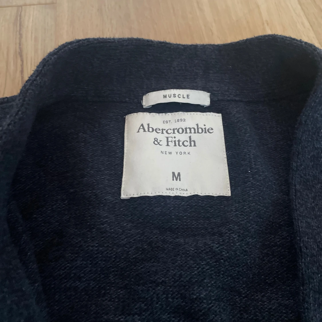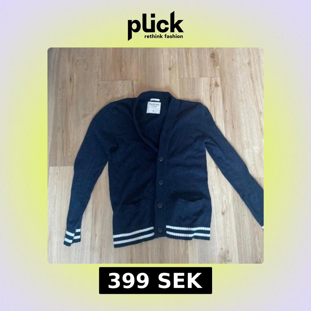 Snygg mörkblå kofta från Abercrombie & Fitch i storlek M. Koftan har knappar framtill, två fickor och vita ränder vid ärmslut och nederkant. Perfekt för lager-på-lager och chill stil.