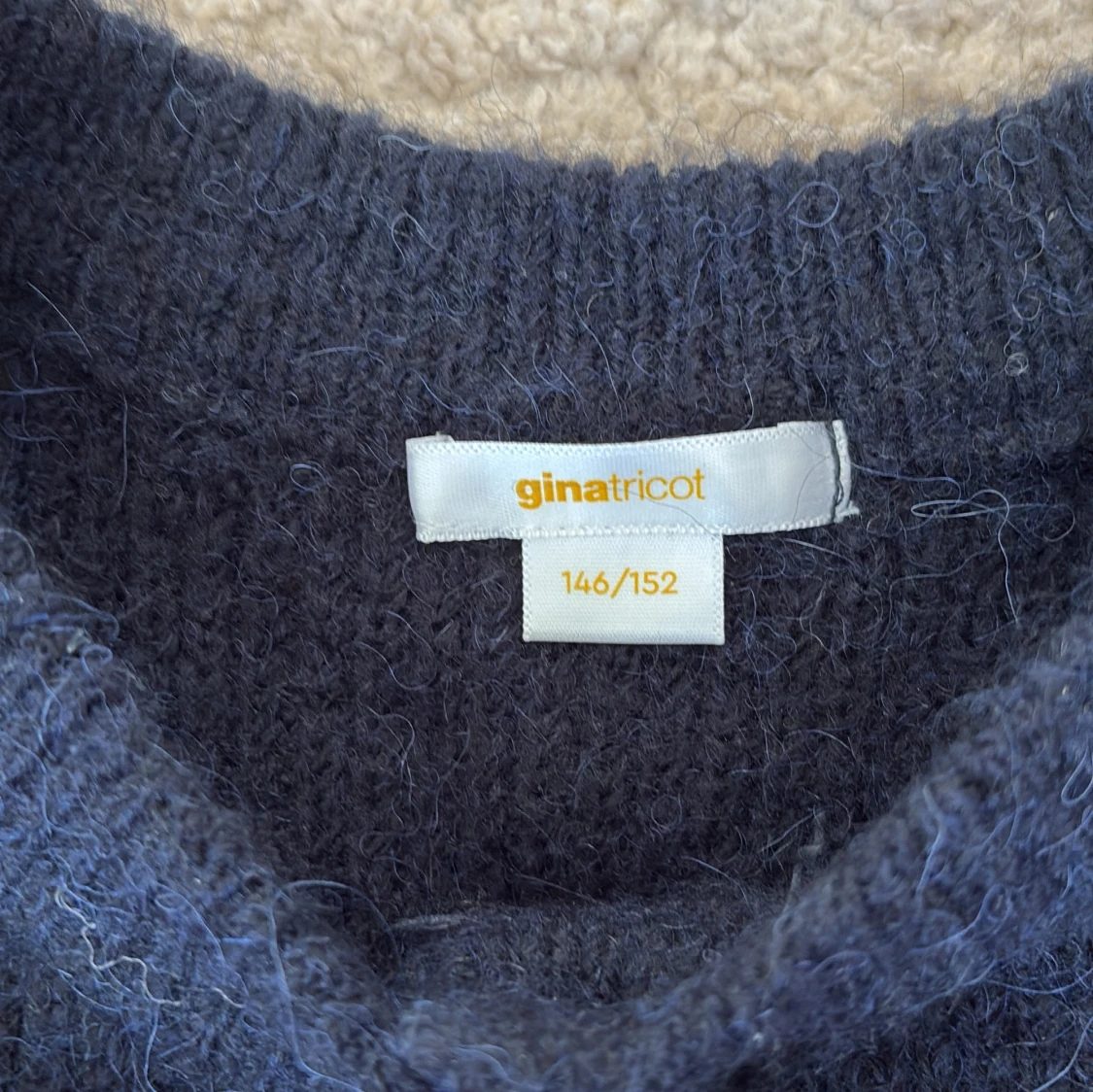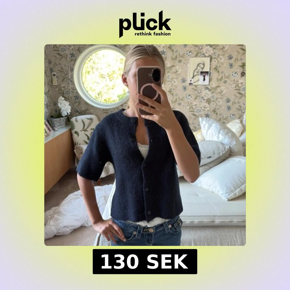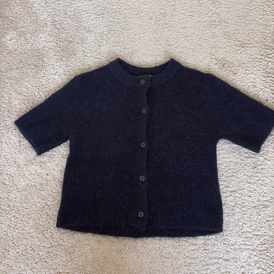 Säljer en mysig mörkblå kofta från Gina Tricot med kort ärm och rund hals. Har nästan aldrig använt. Säljer för att ja inte använder den❤️