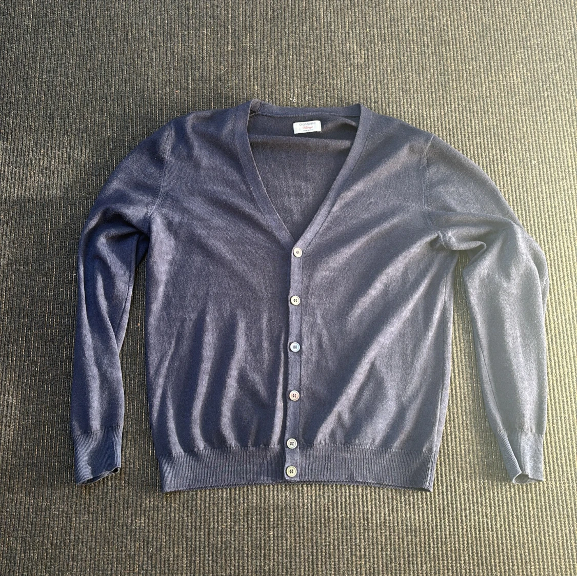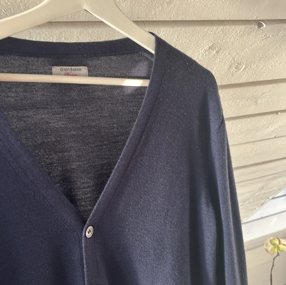 Mörkblå stickad kashmir kofta från Gran Sasso Vintage, tillverkad i Italien. Klassisk v-ringad modell med knappar framtill och långa ärmar. Tunn och mjuk, perfekt för lager-på-lager. Stilren och enkel design som funkar till det mesta. Första bilden mef 3 små hål är på vänster armen, andra bilden med ett hål är på höger armen. Annars jätte fint skick! Hör av er vid funderingar!