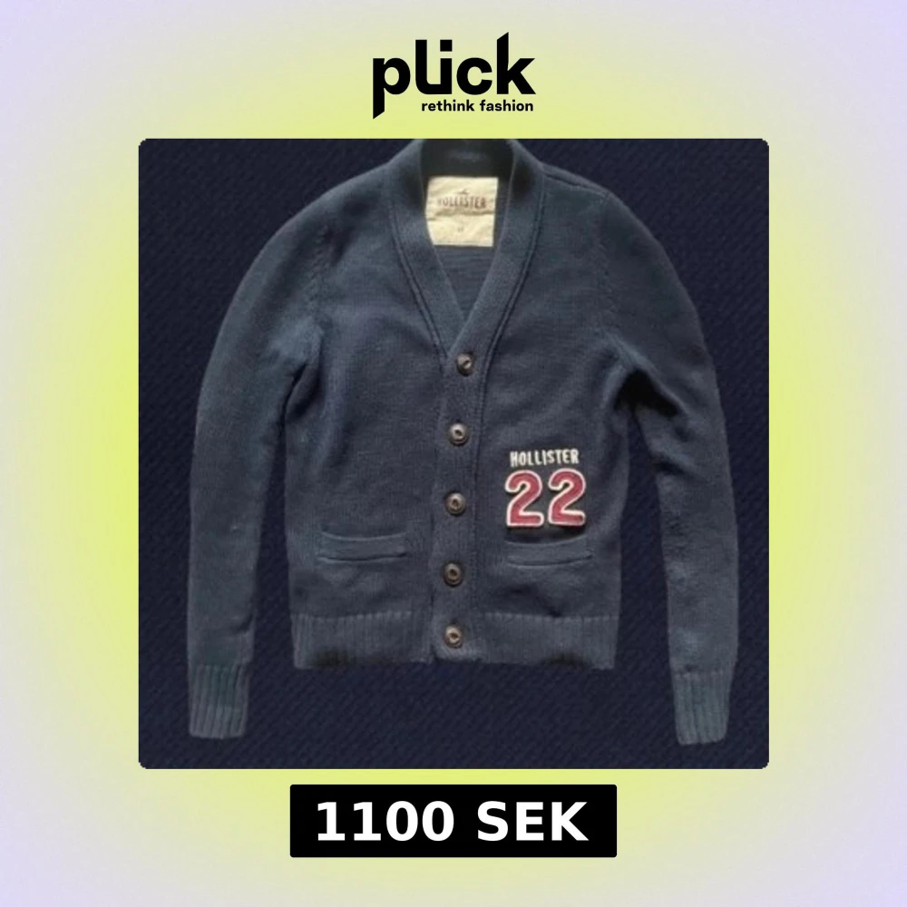 Mörkblå stickad kofta från Hollister med knappar framtill och två fickor. Snygg broderad detalj med 'Hollister 22' på ena sidan. Perfekt för lager-på-lager och chill stil. Skön passform och ribbade muddar vid ärmslut och nederkant.