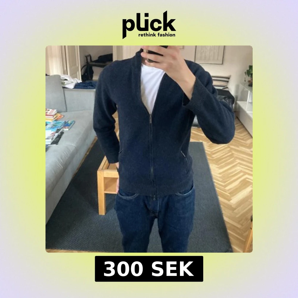 Säljer en stilren mörkblå kofta från Massimo Dutti i ull och kashmir. Koftan har dragkedja och långa ärmar, perfekt för kyliga dagar. Notera att fickorna är trasiga. Passar bra till både jeans och chinos.