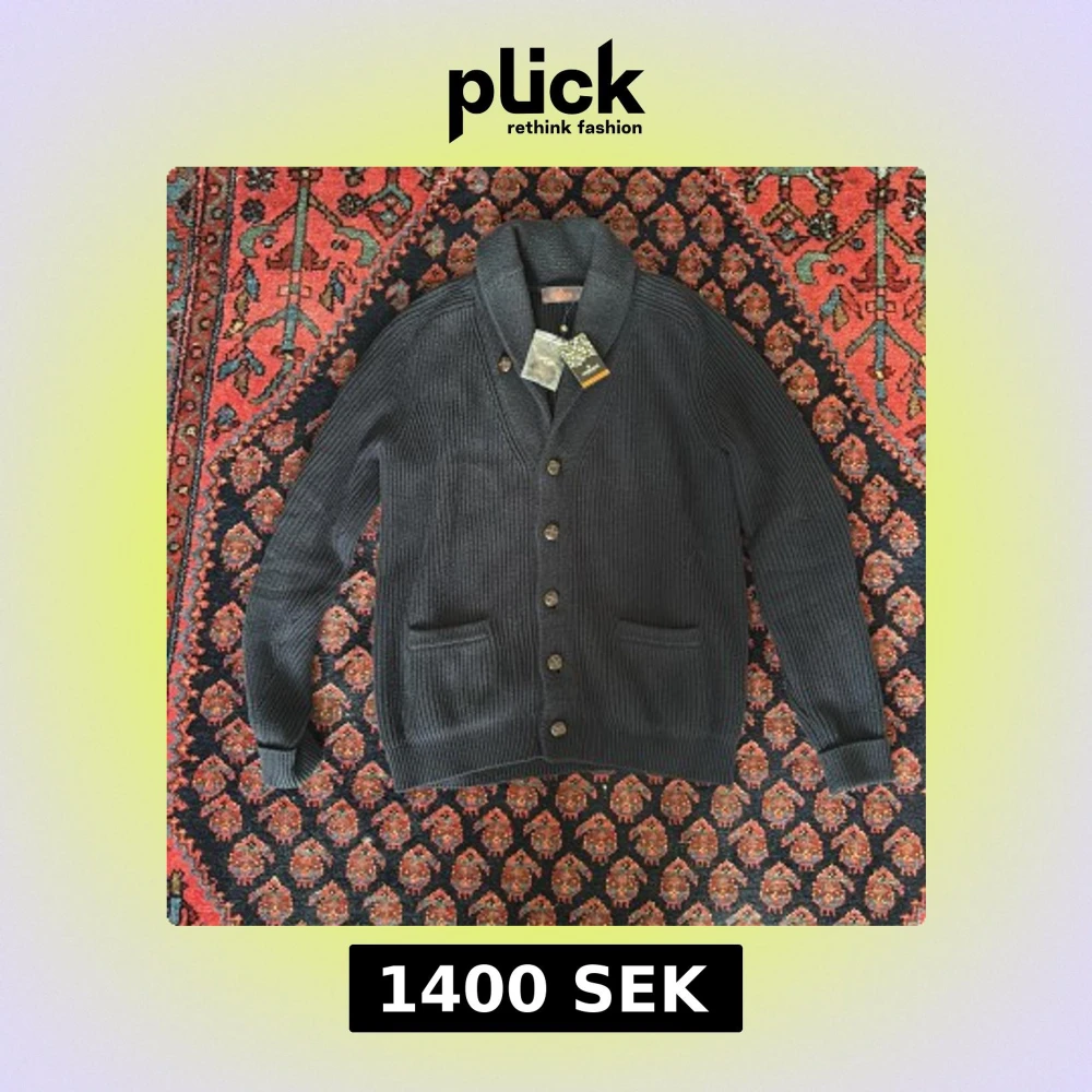 Snygg mörkblå ribbstickad kofta från Morris med sjalkrage och stora knappar framtill. Koftan har två fickor och en klassisk, lite preppy look. Perfekt för lager-på-lager och passar till både jeans och chinos.