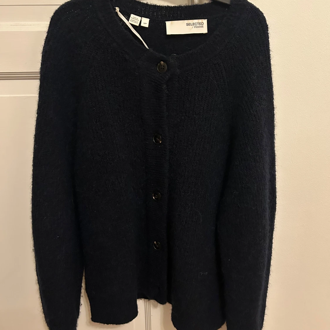 Säljer en mysig mörkblå kofta från Selected Femme. Koftan har en enkel design med rund halsringning, långa ärmar och knappar framtill. Perfekt att slänga på sig över en t-shirt eller linne😍Använd max 5 gånger så mycket bra skick!🥰