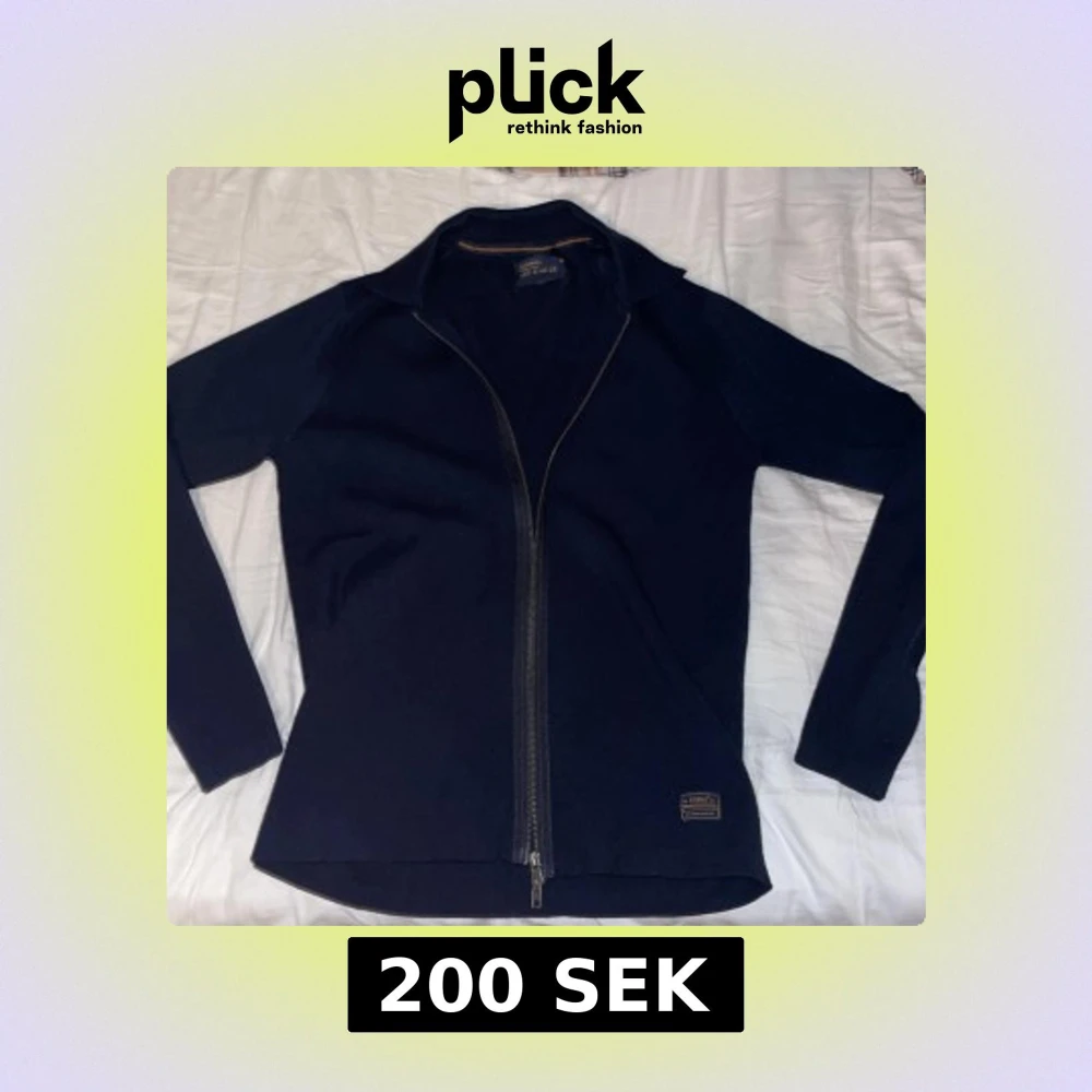 Mörkblå kofta från Signal med hel dragkedja framtill och klassisk krage. Tröjan är långärmad och har en stilren, enkel design som passar perfekt till lager-på-lager. Materialet känns mjukt och är troligtvis bomull eller ullblandning.