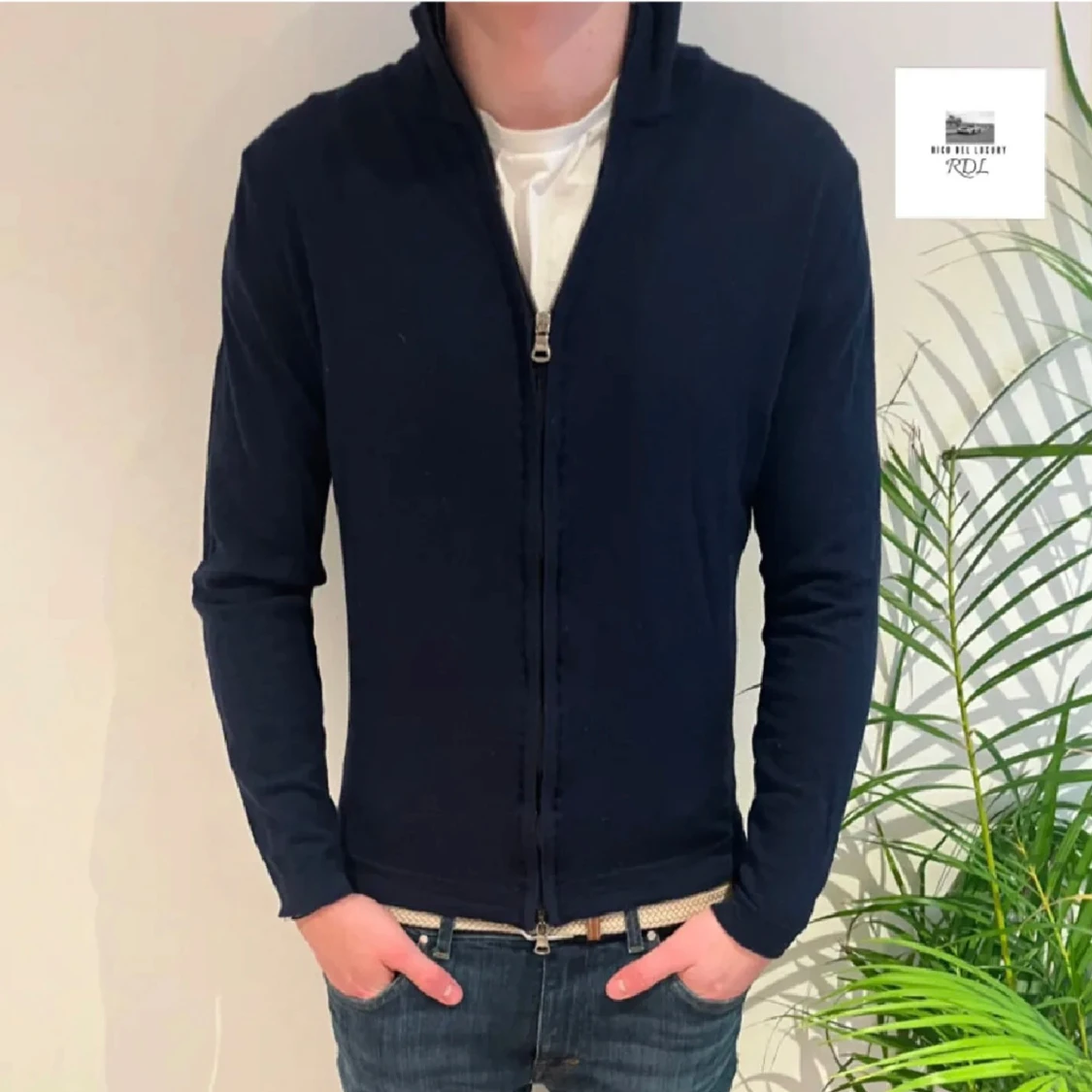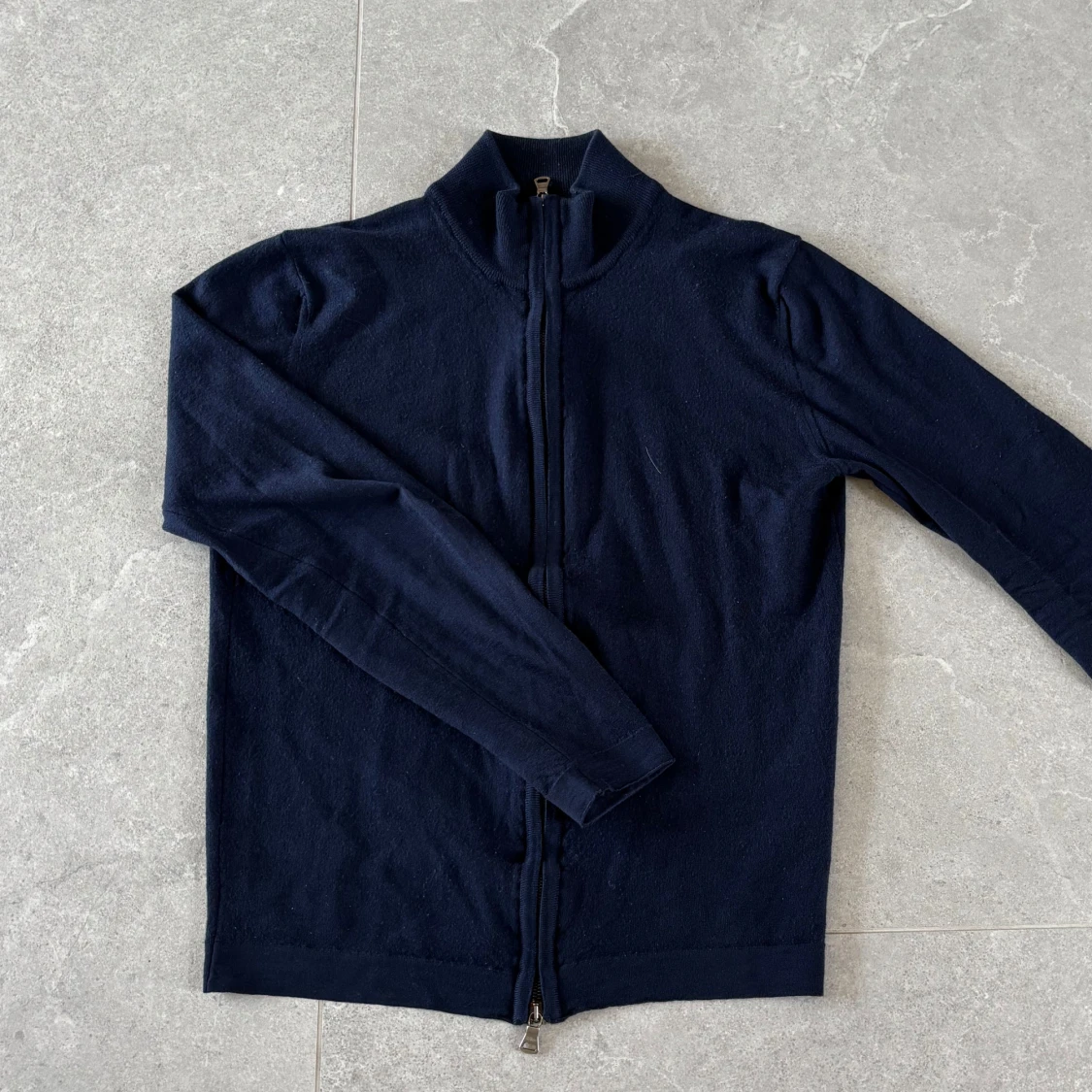 Mörkblå hel zip från Oscar Jacobson i merino ull. Står L men passar mer XS/S. Bra skick. Pris inte fast. Modellen är runt 180, den passar ungefär 172-182.