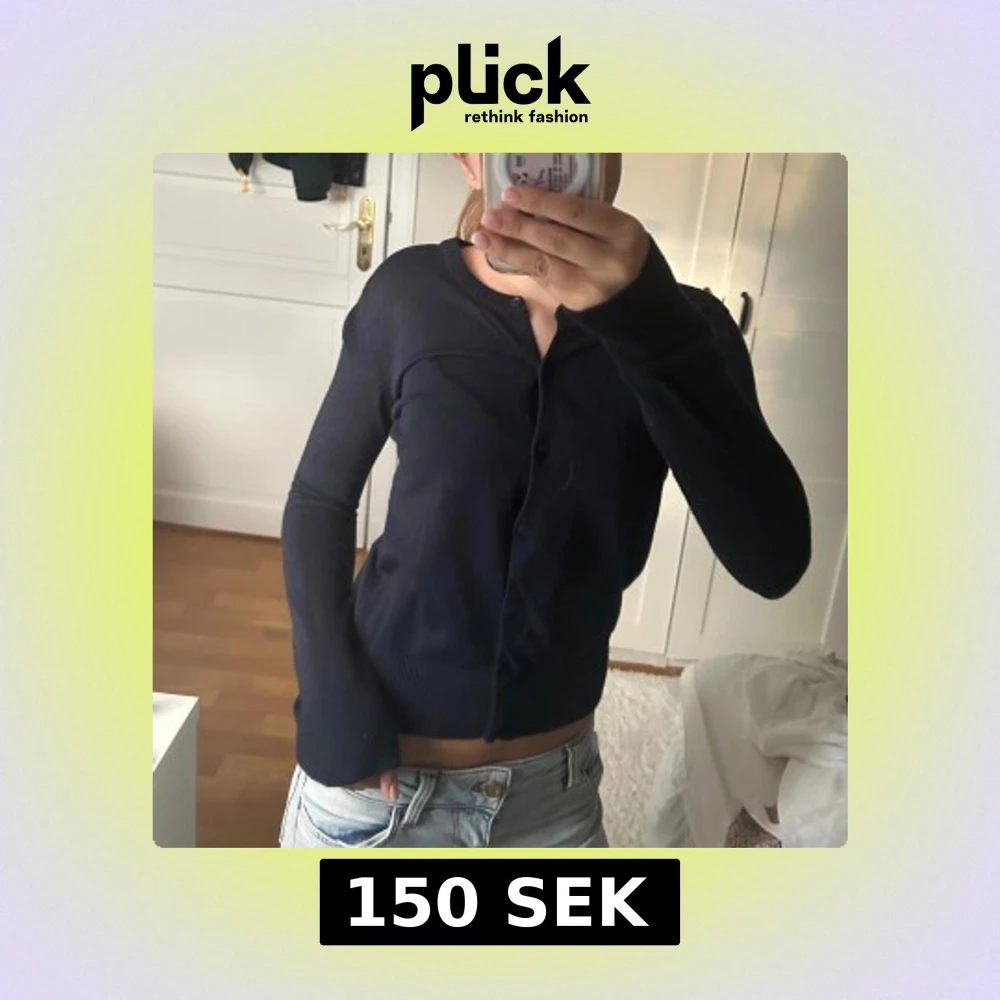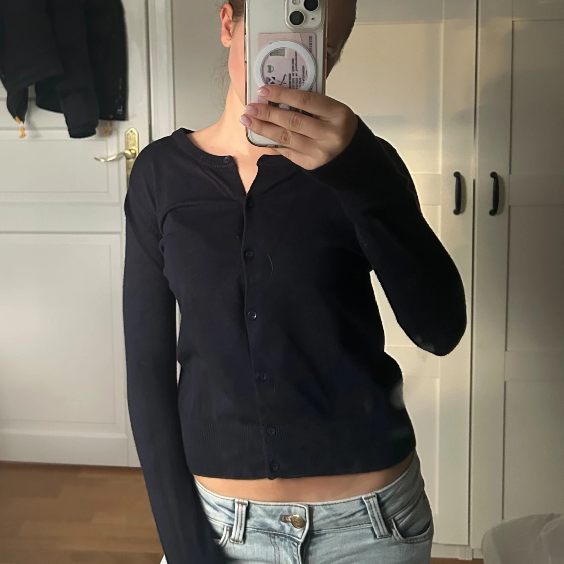 En stilren mörkblå kofta med rund hals och knäppning framtill. Långärmad och i mjukt, tunt material som passar perfekt till lager-på-lager. Enkel och clean look som funkar till allt, och sitter snyggt med en lite croppad passform.