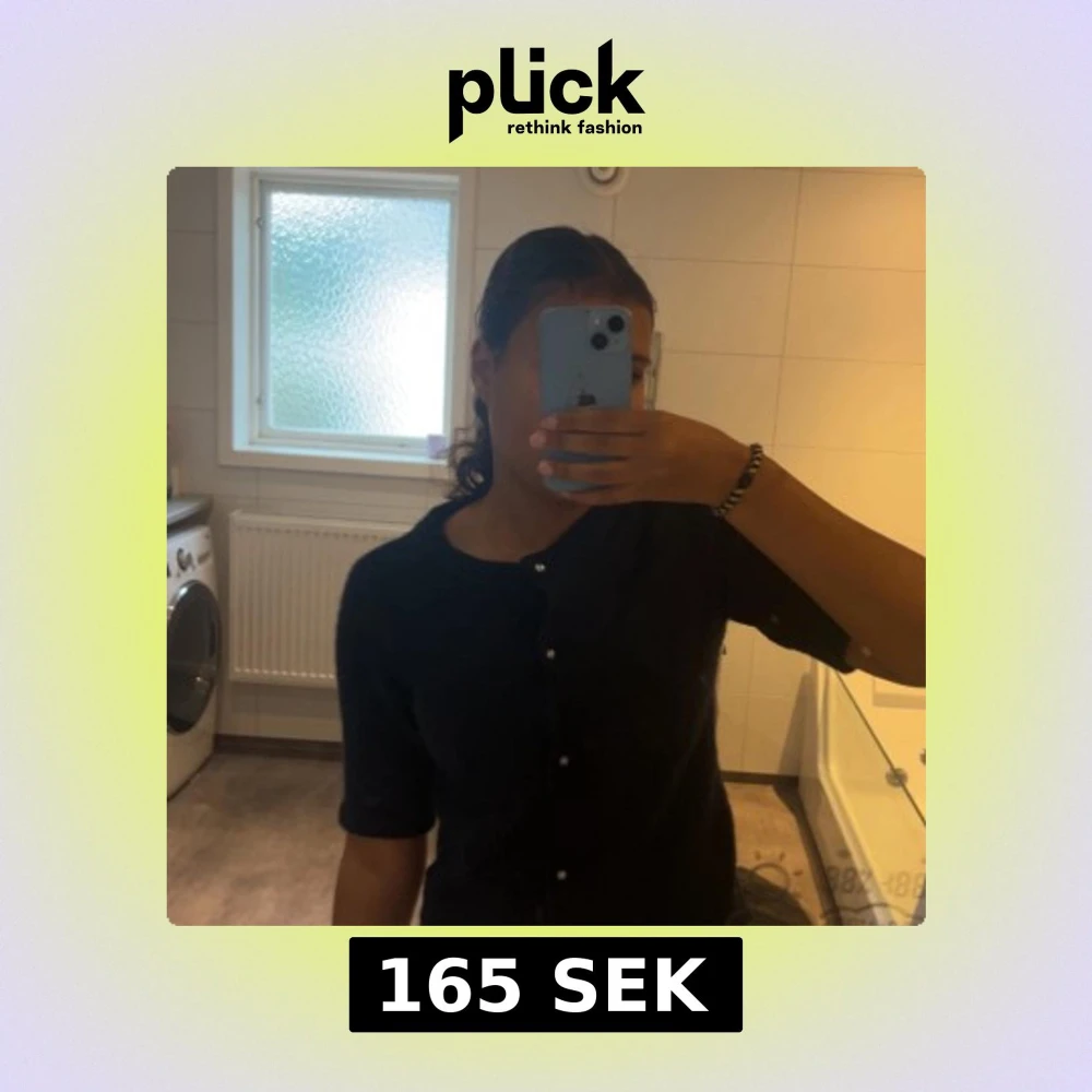 Säljer en mörkblå kofta med halvlånga ärmar och snygga pärlknappar framtill. Koftan har en klassisk rund halsringning och är perfekt att slänga över en topp. Enkel och stilren design som passar till mycket.