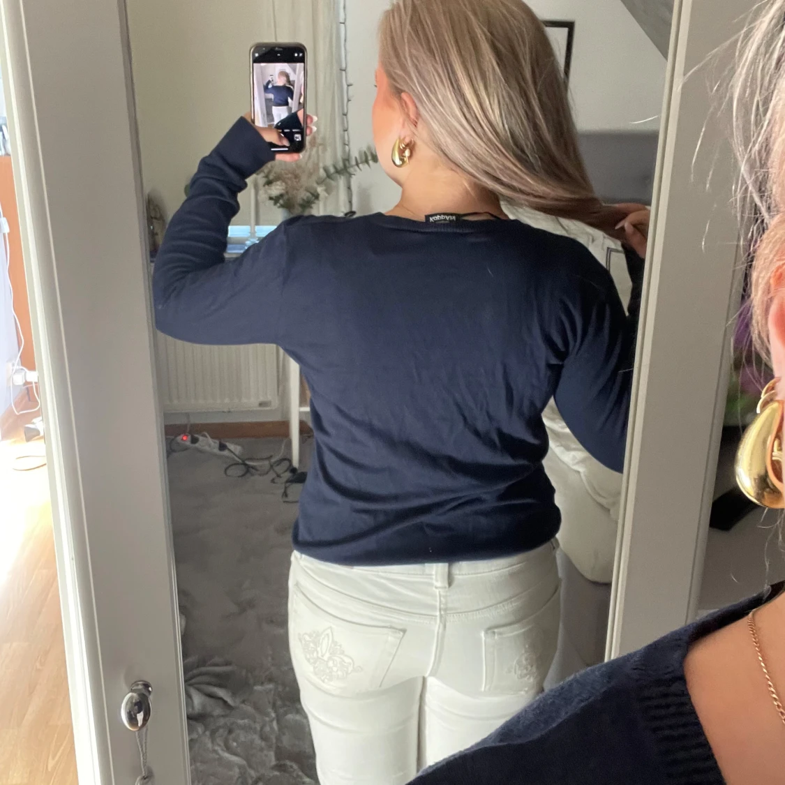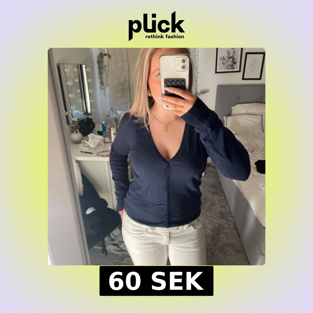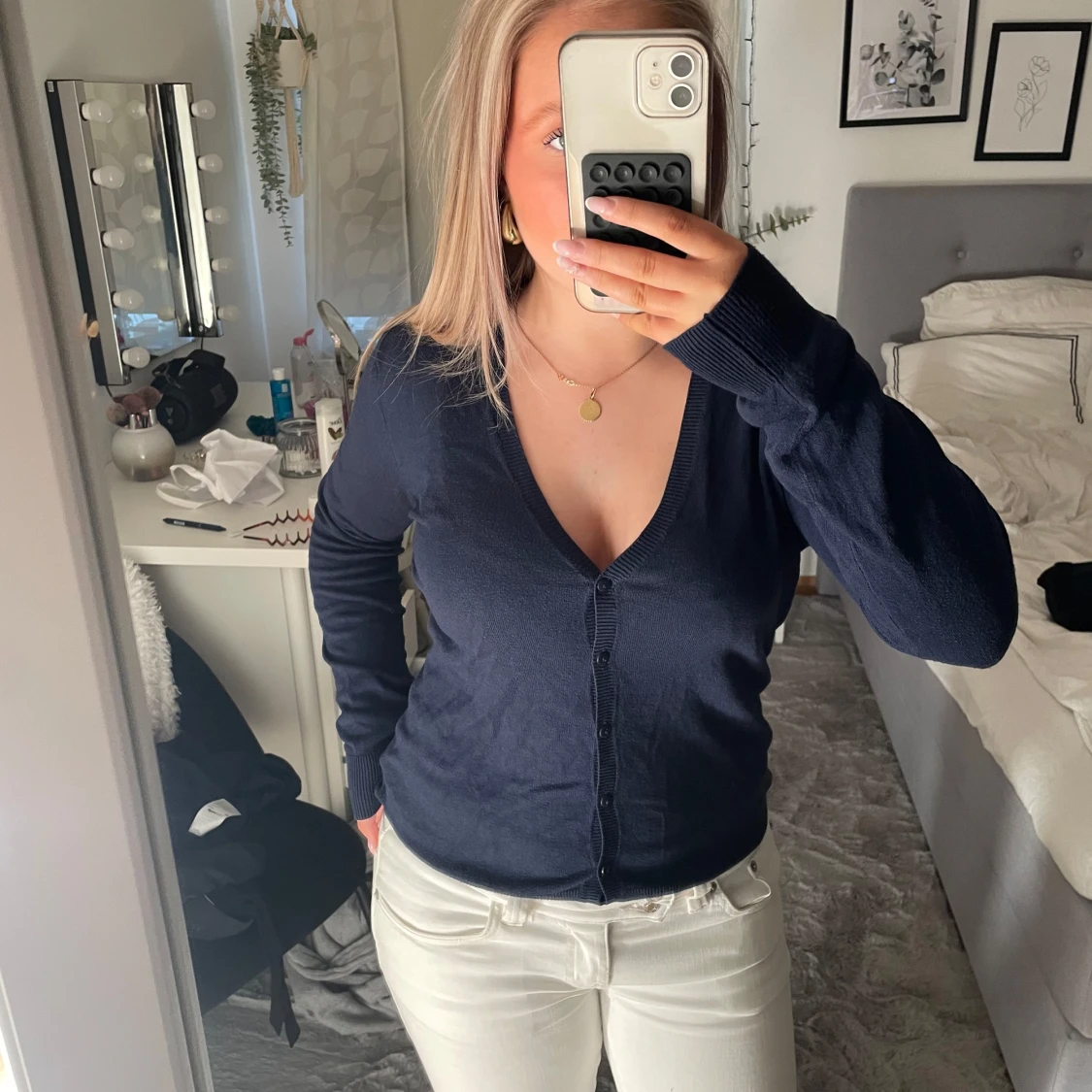 Mörkblå kofta från Kappahl med djup v-ringning och knappar framtill. Långärmad och i tunn, mjuk bomullsblandning som passar perfekt till lager-på-lager. Enkel och stilren design som funkar till det mesta.