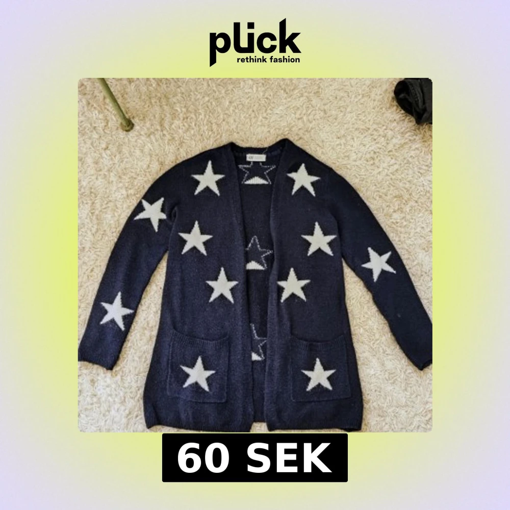 Snygg mörkblå kofta från H&M med vita stjärnor över hela tröjan. Koftan har två fickor framtill och är stickad i mjukt material. Långärmad och loose passform, koftan är i storlek 146/157 och nästintill aldrig använd. Perfekt till den kalla hösten och vintern.