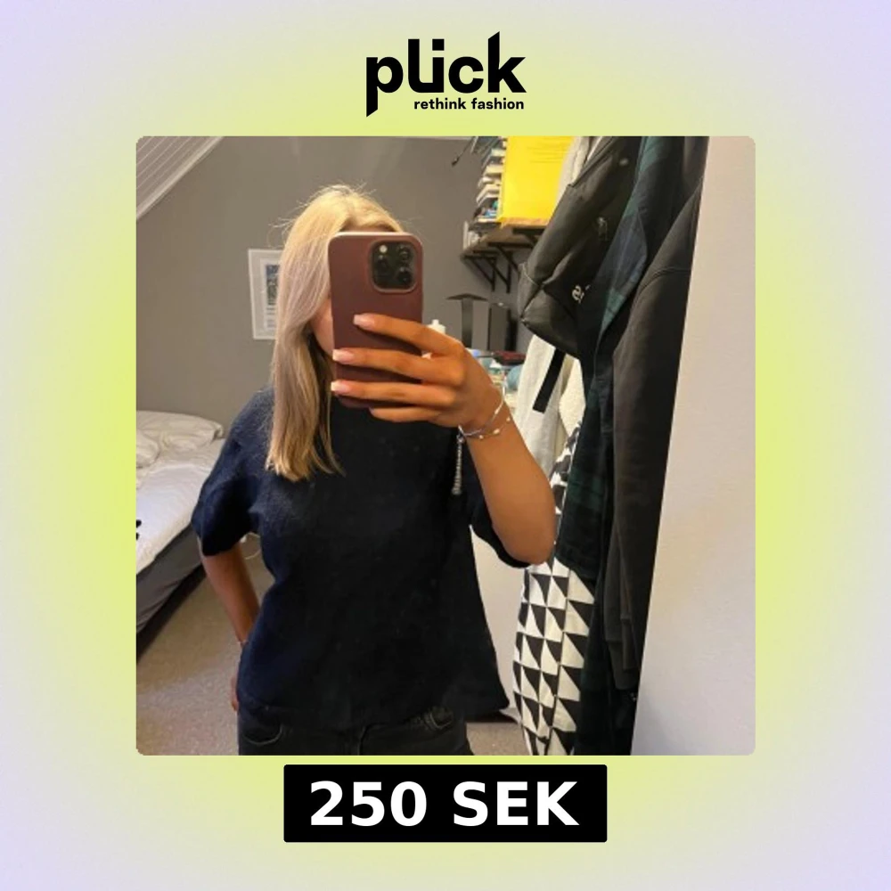 Säljer en stilren mörkblå tröja med korta ärmar. Det är dn stickad T-shirt från Gina Tricot som köptes förra året men som knappt kommit till användning och som därav är i väldigt bra skick! Köptes för 299kr!