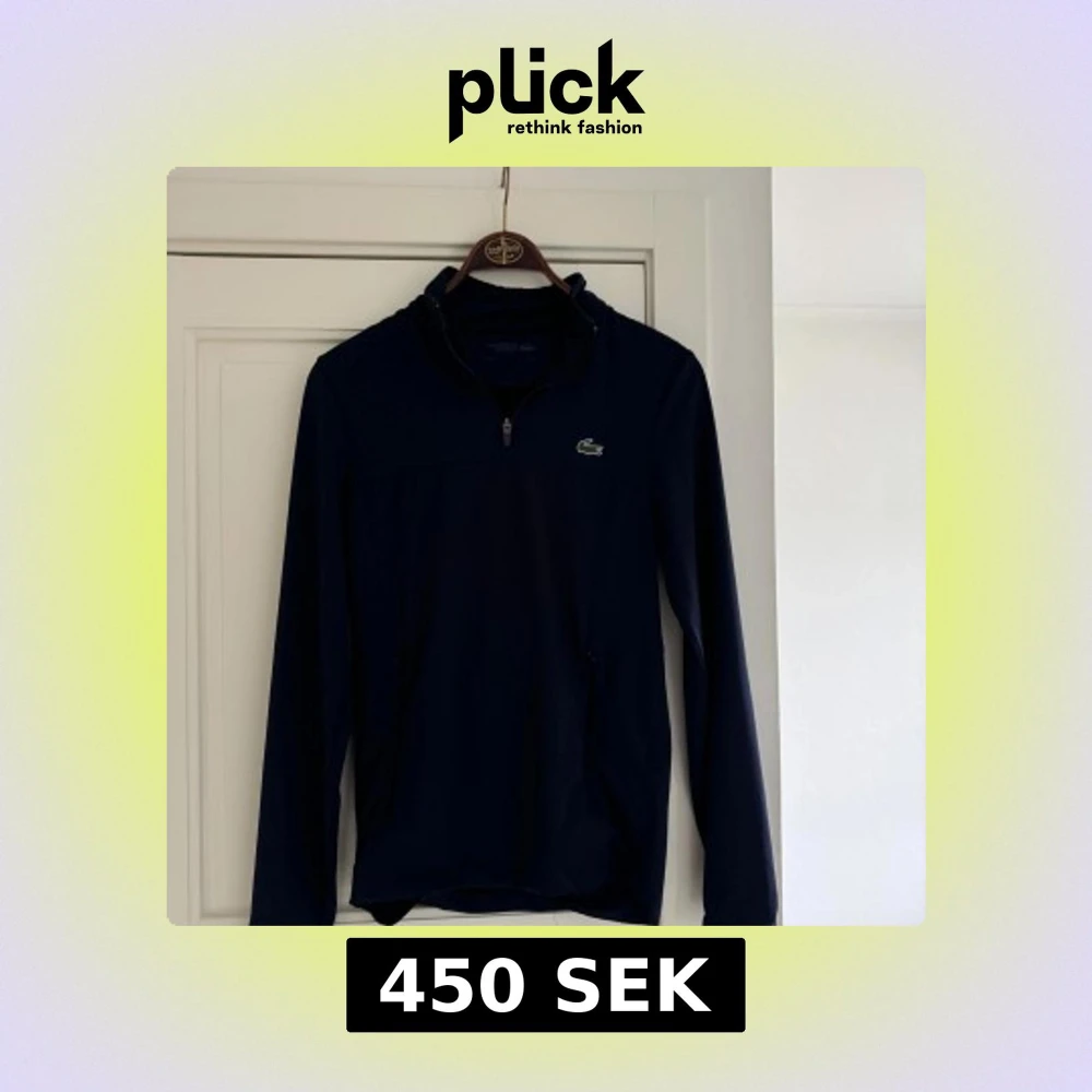 Säljer en stilren mörkblå tröja från Lacoste Sport med dragkedja vid halsen och det klassiska krokodilemblem på bröstet. Tröjan har långa ärmar och är perfekt för en sportig look.