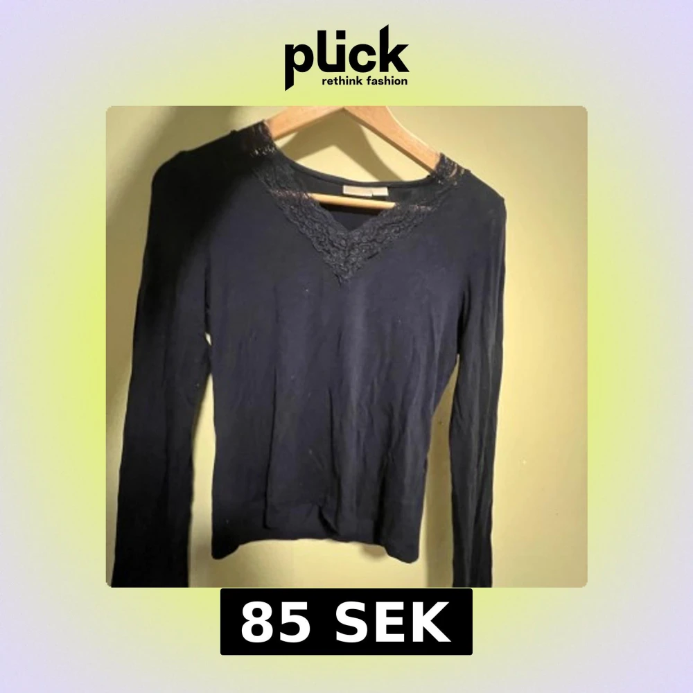 Säljer en stilren blå långärmad topp från Gina Tricot med vacker spetsdetalj vid halsringningen. Perfekt för en elegant look. Passar bra till både jeans och kjol.