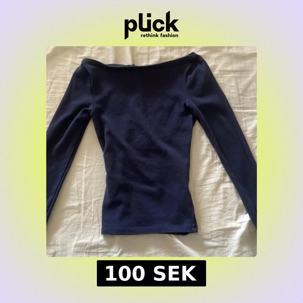Säljer en mörkblå långärmad topp med bred, nästan båtringad hals. Modellen är tight och materialet känns mjukt och stretchigt, perfekt för en stilren look. Passar dig som gillar enkla men snygga basplagg.