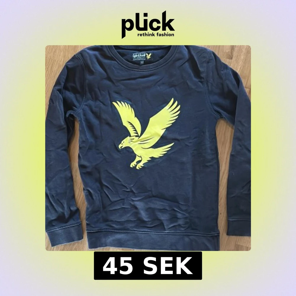 Säljer en mörkblå långärmad tröja från Lyle & Scott Junior med en stor gul örn på bröstet. Tröjan har rund halsringning och är tillverkad i mjuk bomull.