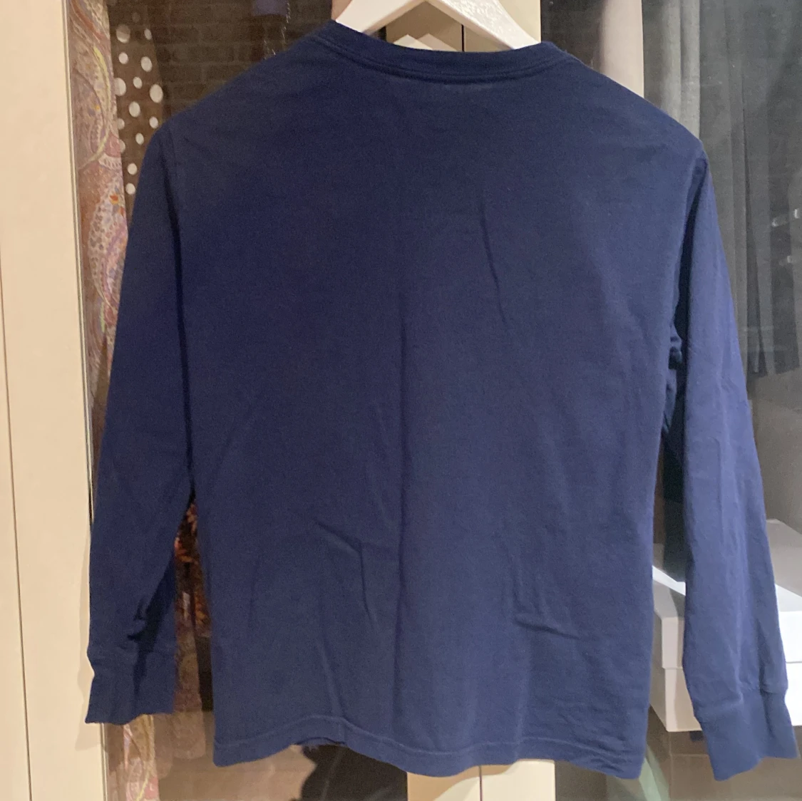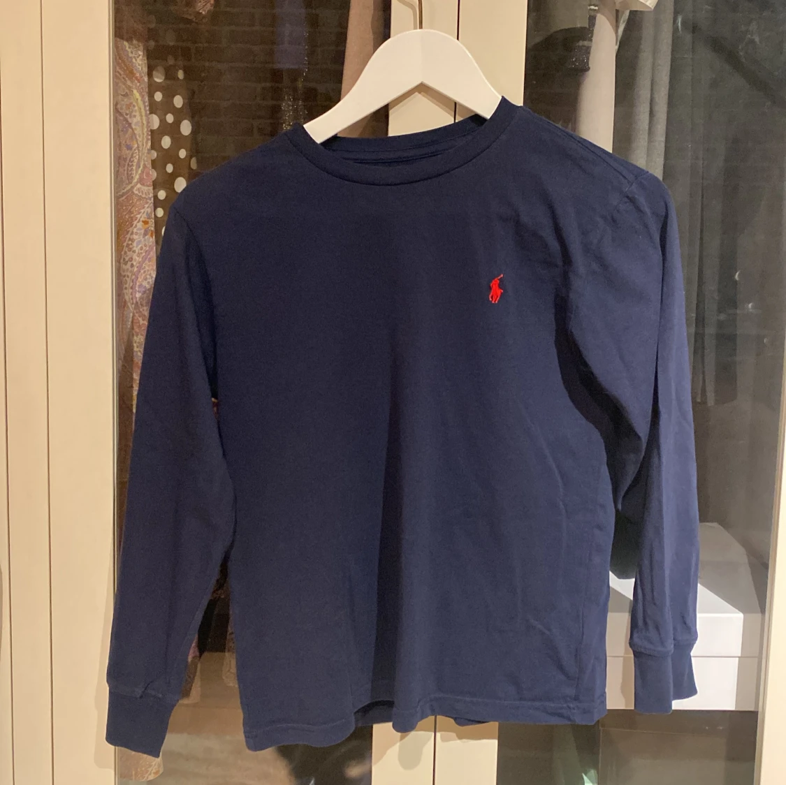 Säljer en stilren mörkblå långärmad tröja från Polo Ralph Lauren med det klassiska röda logotypen på bröstet. Perfekt för en avslappnad och snygg look. Tröjan är tillverkad i mjukt bomullsmaterial.