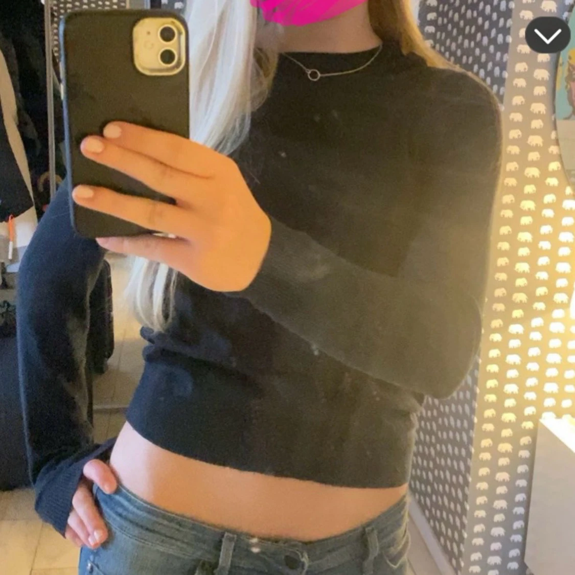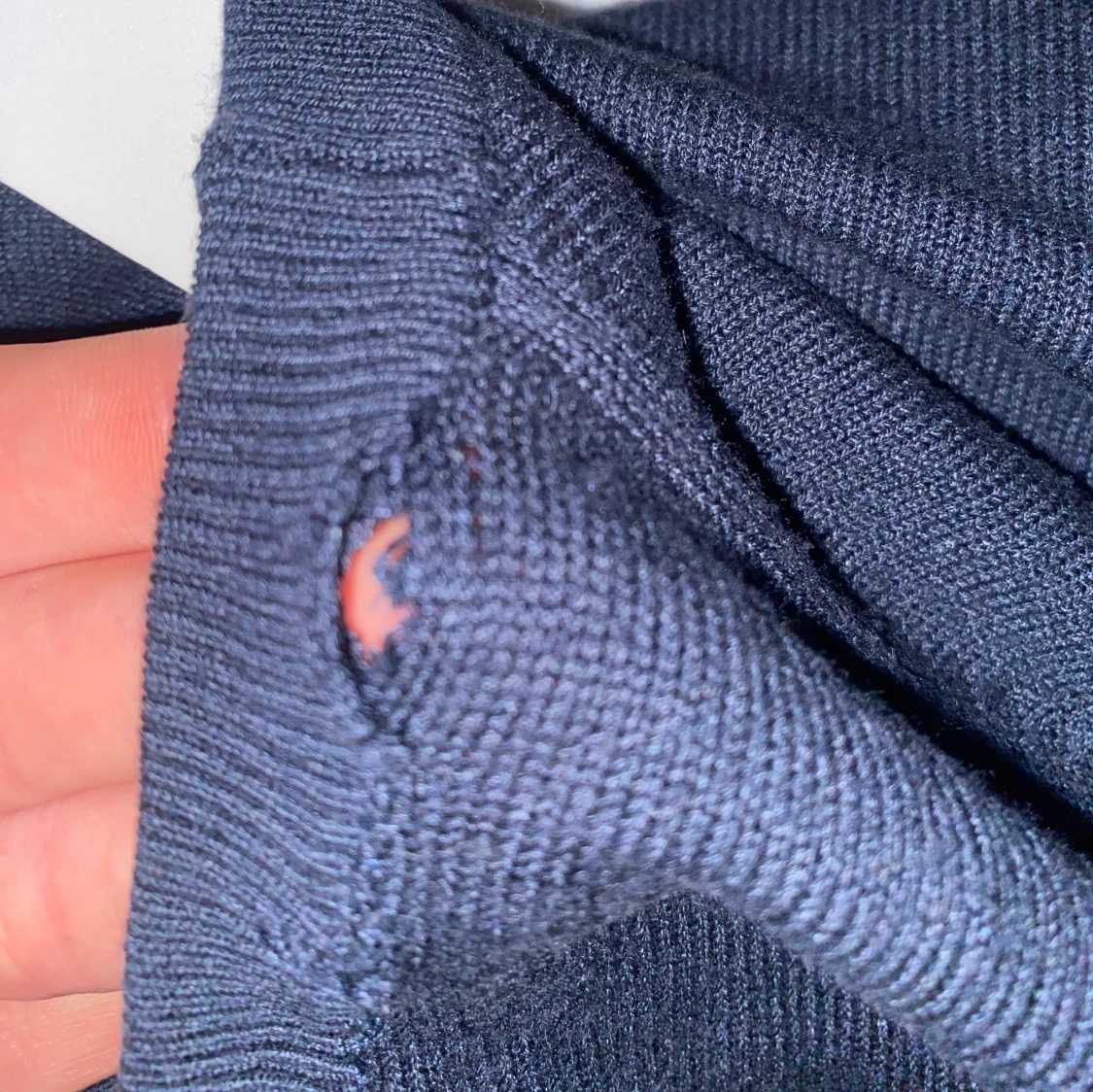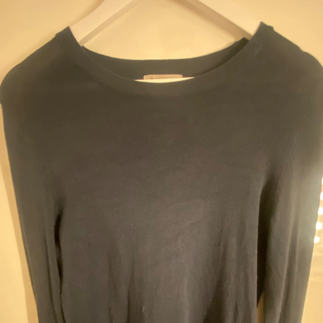 Säljer en mörkblå långärmad tröja i mjukt material. Tröjan har en enkel design och passar bra till alla jeans💕 finns ett hål (se bild 4) men som går att laga enkelt.