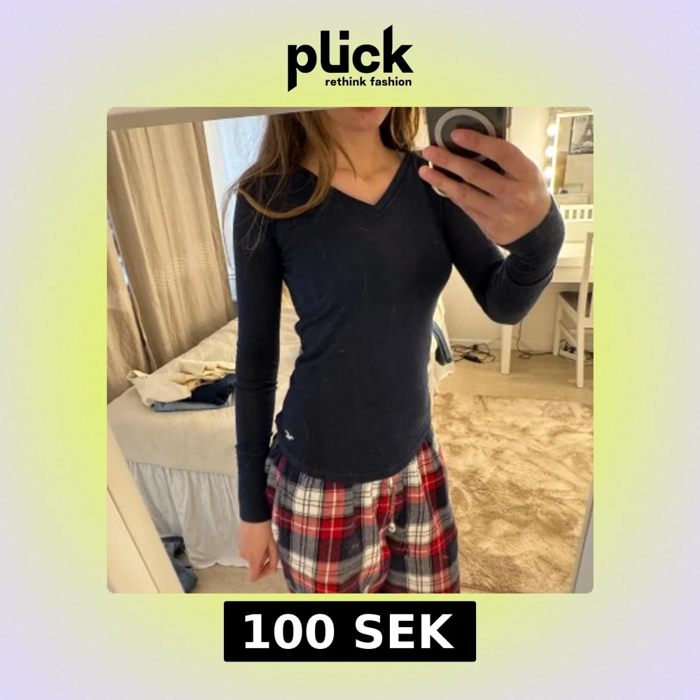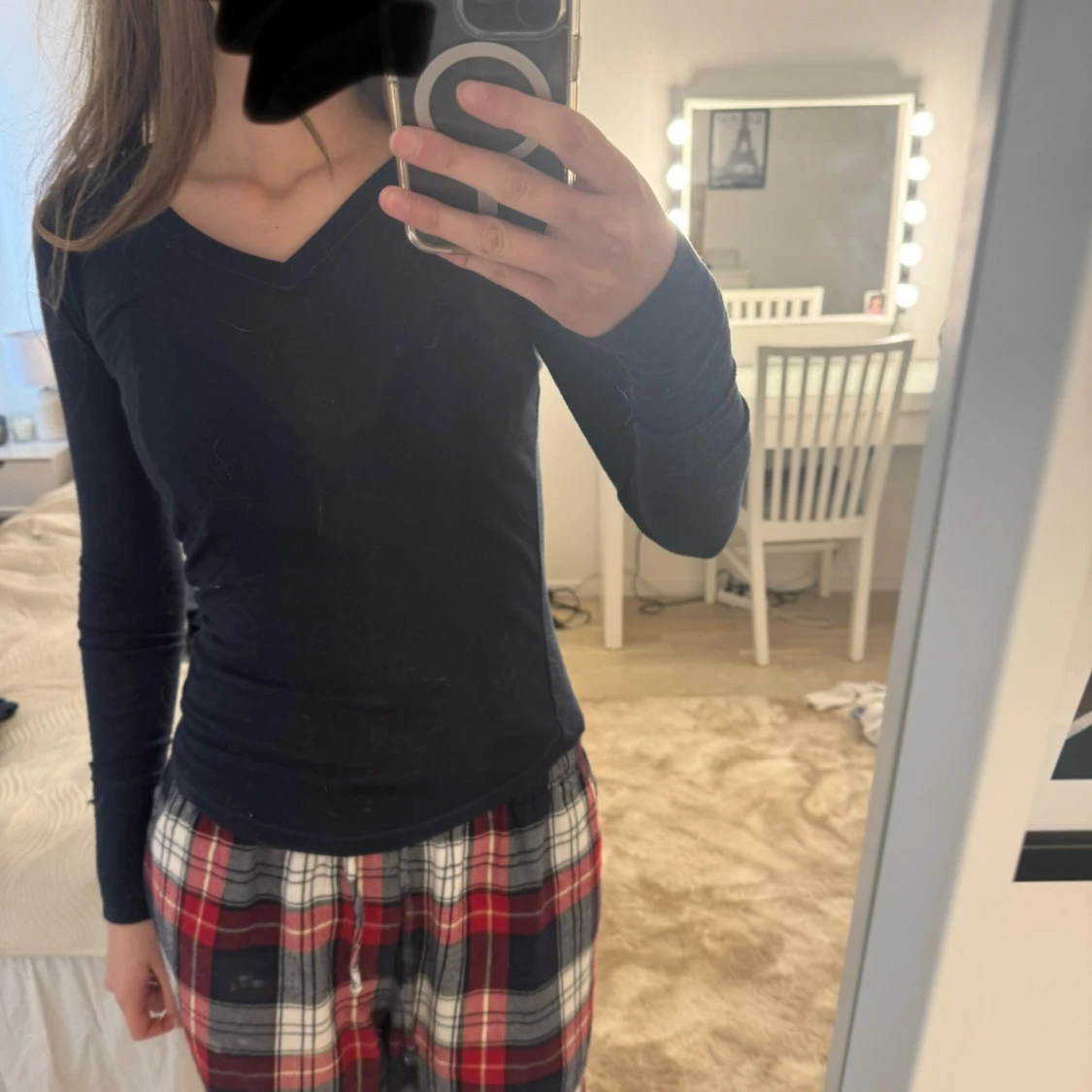 Säljer en mörkblå långärmad tröja med v-ringning. Tröjan har en tight passform och är enkel i designen, perfekt att matcha med olika outfits. Materialet känns mjukt och stretchigt.