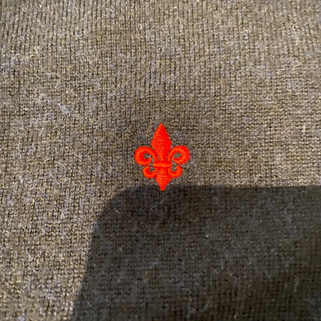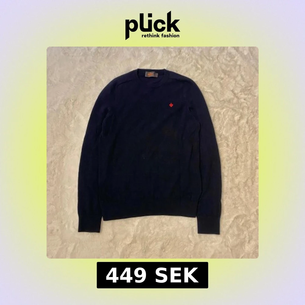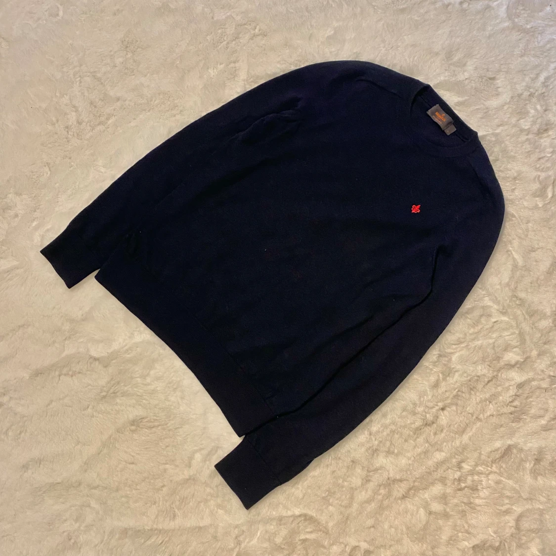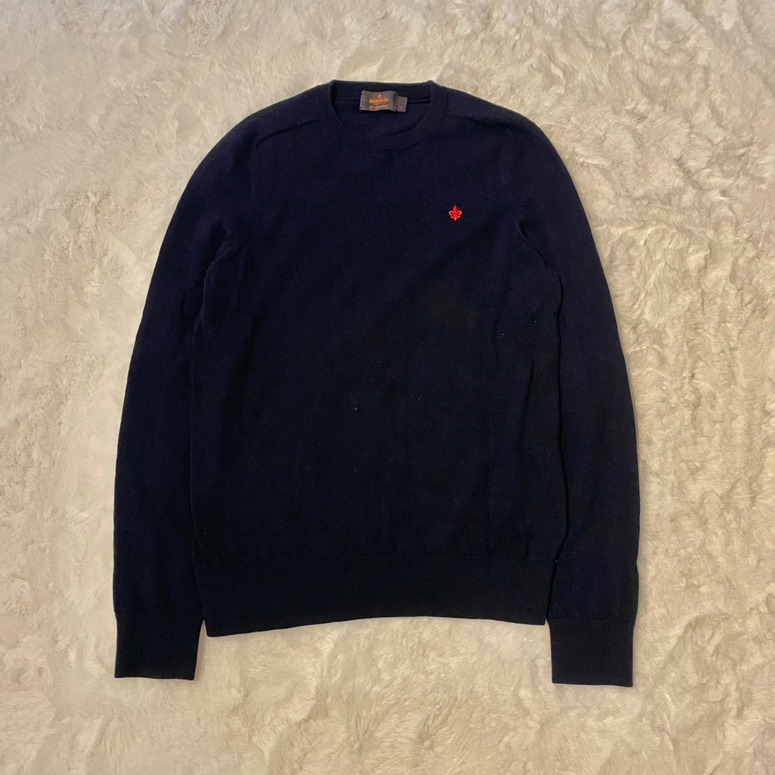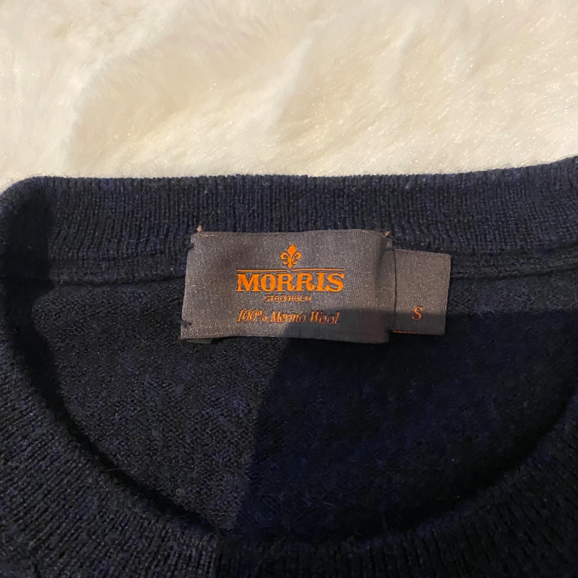 Mörkblå stickad tröja från Morris i 100% merinoull. Klassisk modell med rund halsringning och lång ärm. Broderad röd lilja på bröstet ger en snygg detalj. Perfekt för dig som gillar stilrena och tidlösa plagg.