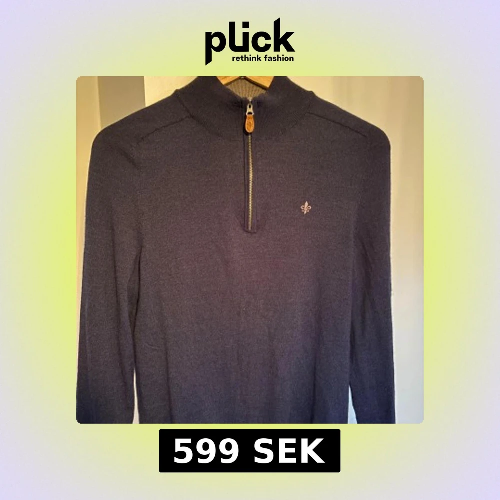 Säljer en mörkblå stickad tröja från Morris i 100% merinoull. Tröjan har half zip med läderdetalj, hög krage och broderad logga på bröstet. Perfekt för lager-på-lager och snygg till jeans eller chinos. Passar nog också storlek S