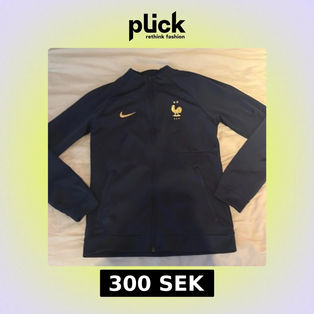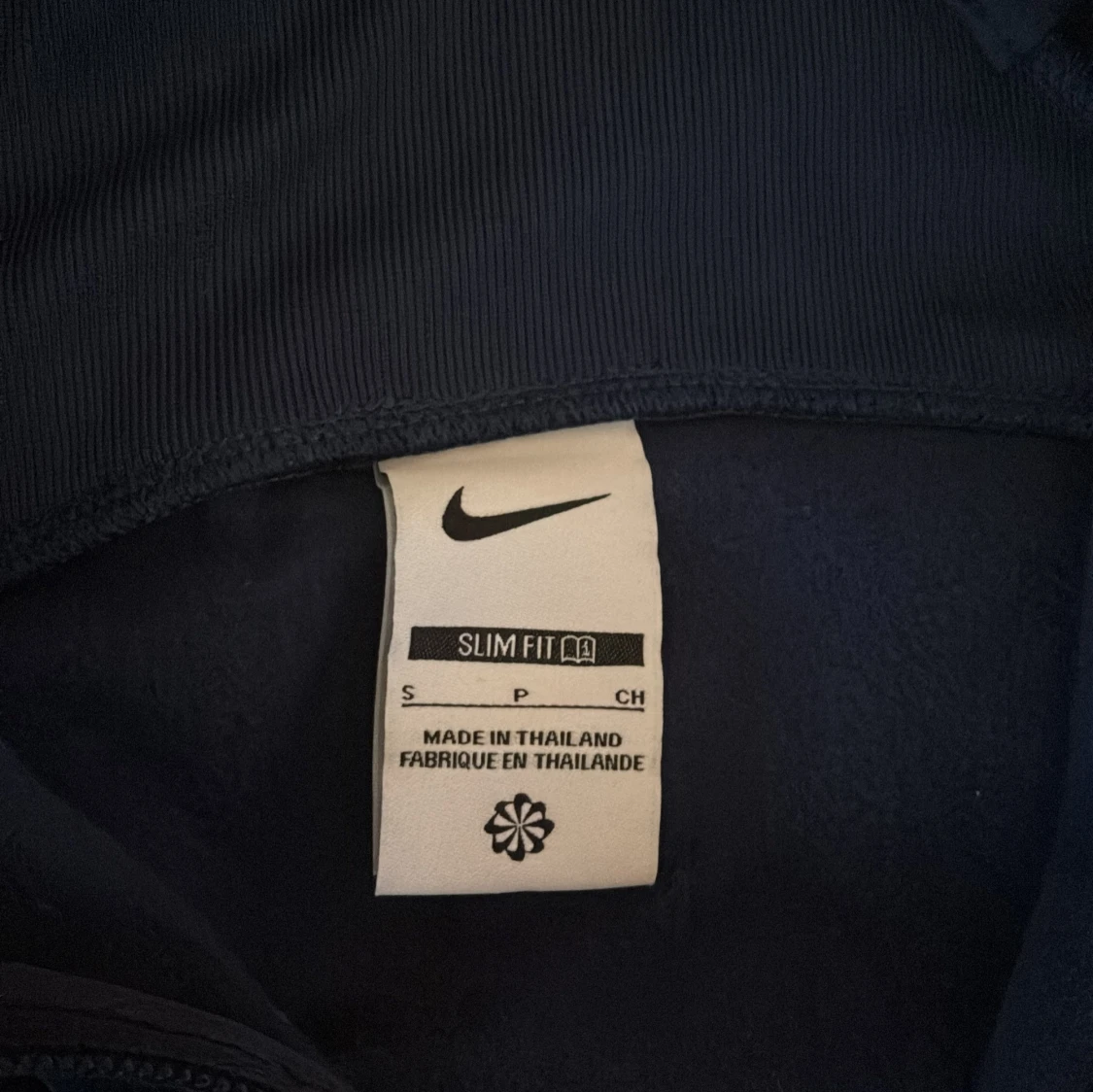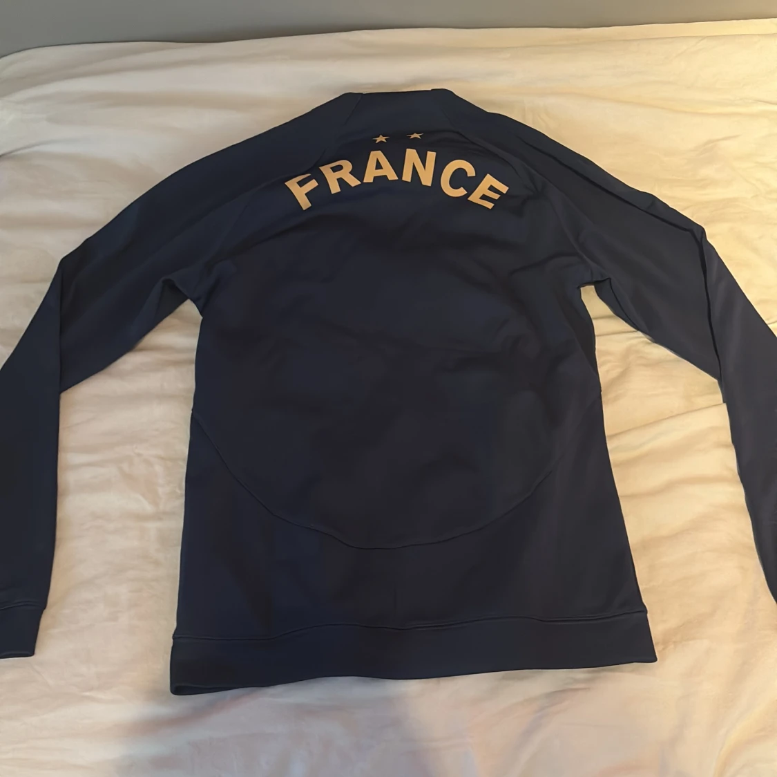 Marinblå ziptröja från Nike med Frankrikes landslagsemblem och guldiga detaljer. Slim fit-modell med hel dragkedja, långa ärmar och FRANCE-tryck på ryggen. Perfekt för fotbollsfans som vill ha en sportig och snygg look.