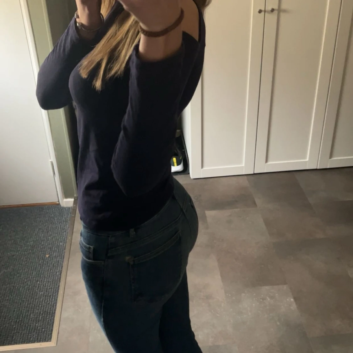 Säljer en mörkblå långärmad topp med offshoulder-detalj på axlarna. Snygg och enkel modell med rund halsringning och figurnära passform. Perfekt för dig som vill ha en stilren men ändå trendig look.