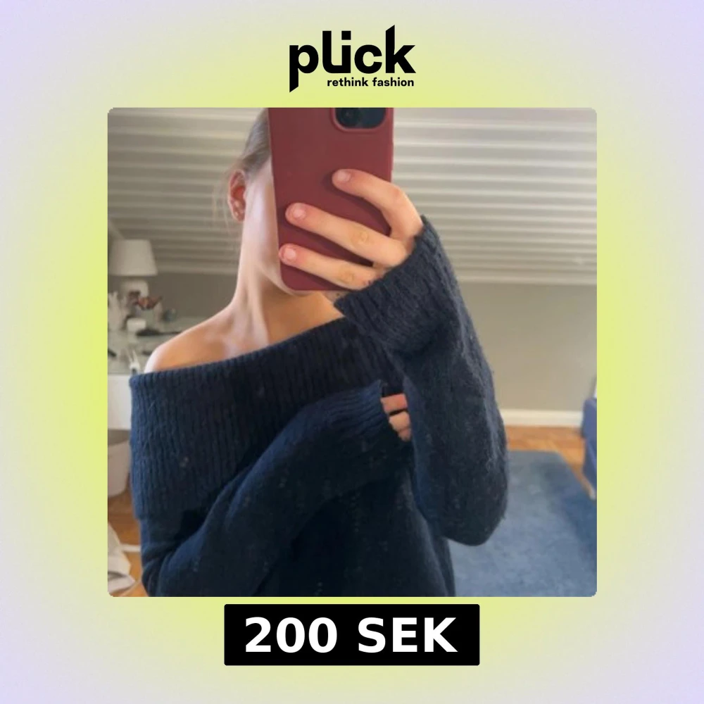 Säljer en mysig mörkblå stickad tröja med offshoulder-design. Perfekt för kyliga dagar när du vill ha något bekvämt och stilrent. Tröjan har långa ärmar och en avslappnad passform. Passar perfekt till jeans eller kjol.