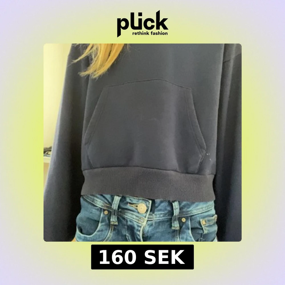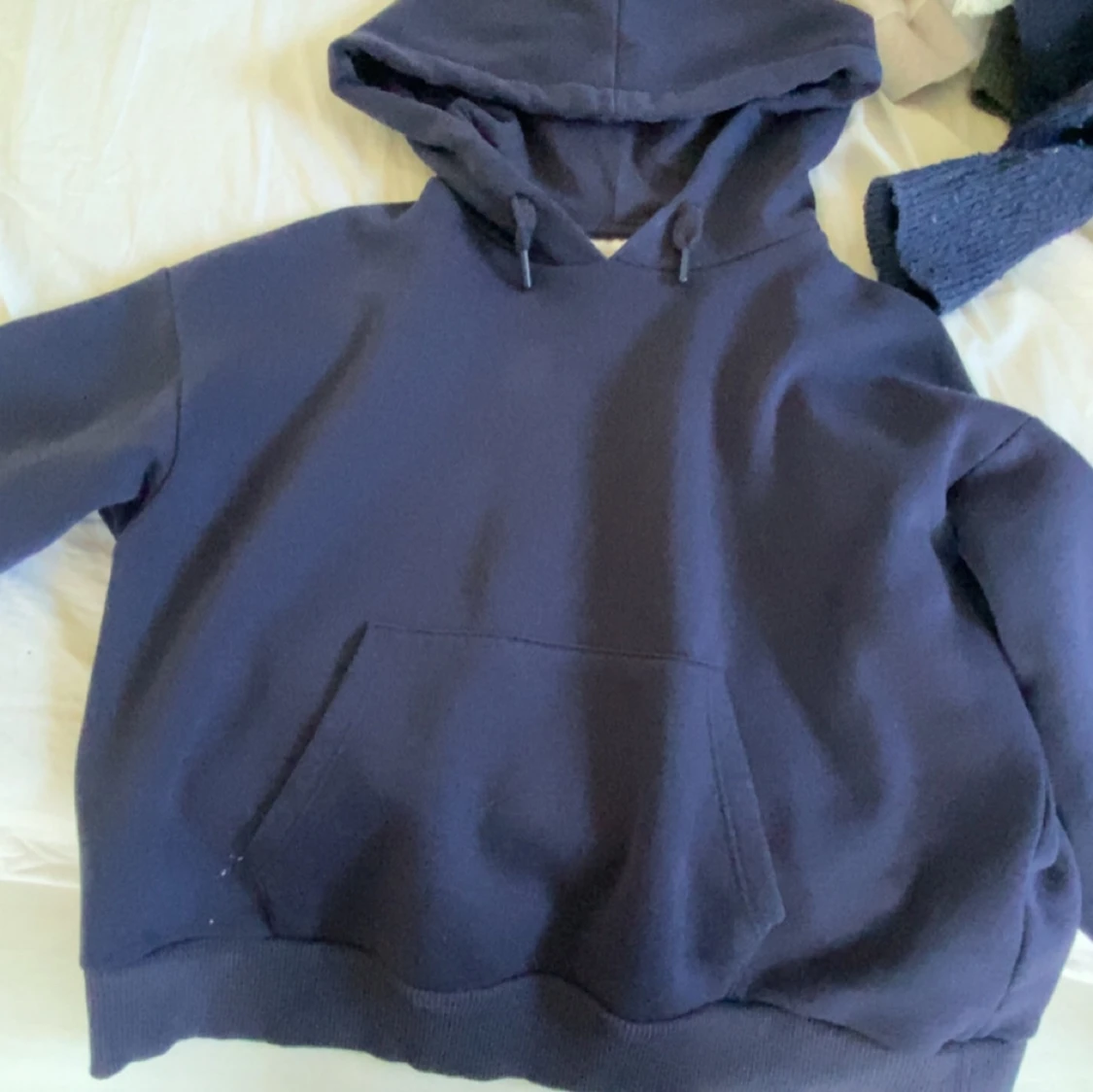 Mörkblå hoodie med stor magficka och huva. Tröjan har långa ärmar och bred mudd vid midjan. Perfekt för en avslappnad stil och passar bra till jeans.