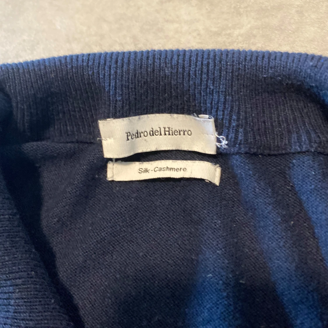 Snygg mörkblå tröja från Pedro del Hierro i lyxig blandning av silke och kashmir. Tröjan har en stilren half zip vid halsen och diskret broderad logga på bröstet. Perfekt för dig som gillar klassisk och bekväm stil med premiumkänsla. Mått, längd 64cm, bredd 53cm, armlängd 50cm | kolla gärna in profilen för liknande produkter och skriv vid minsta lilla fråga
