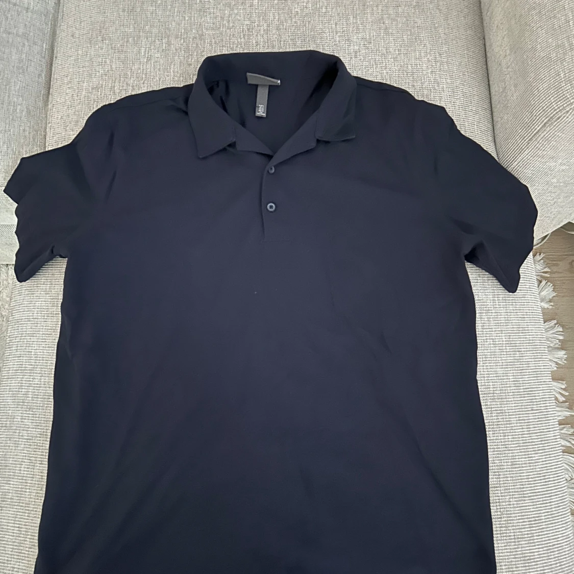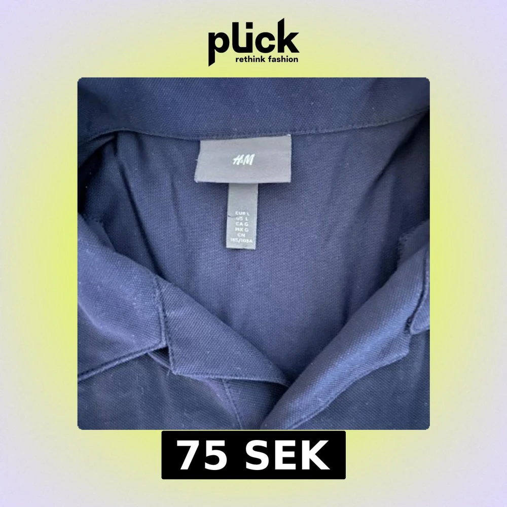 Säljer en stilren mörkblå pikétröja från H&M i storlek L. Tröjan har klassisk krage och knäppning med två knappar framtill. Perfekt för en clean och enkel look.