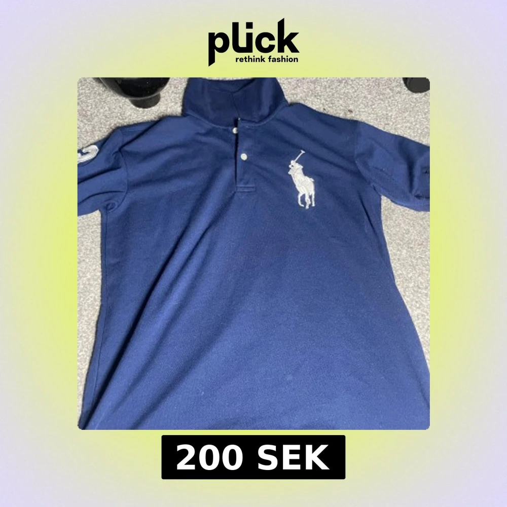 Säljer en snygg mörkblå pikétröja från Ralph Lauren med klassisk krage och knappar. Tröjan har en stor vit logotyp på bröstet och en siffra på ärmen. Perfekt för en stilren look!